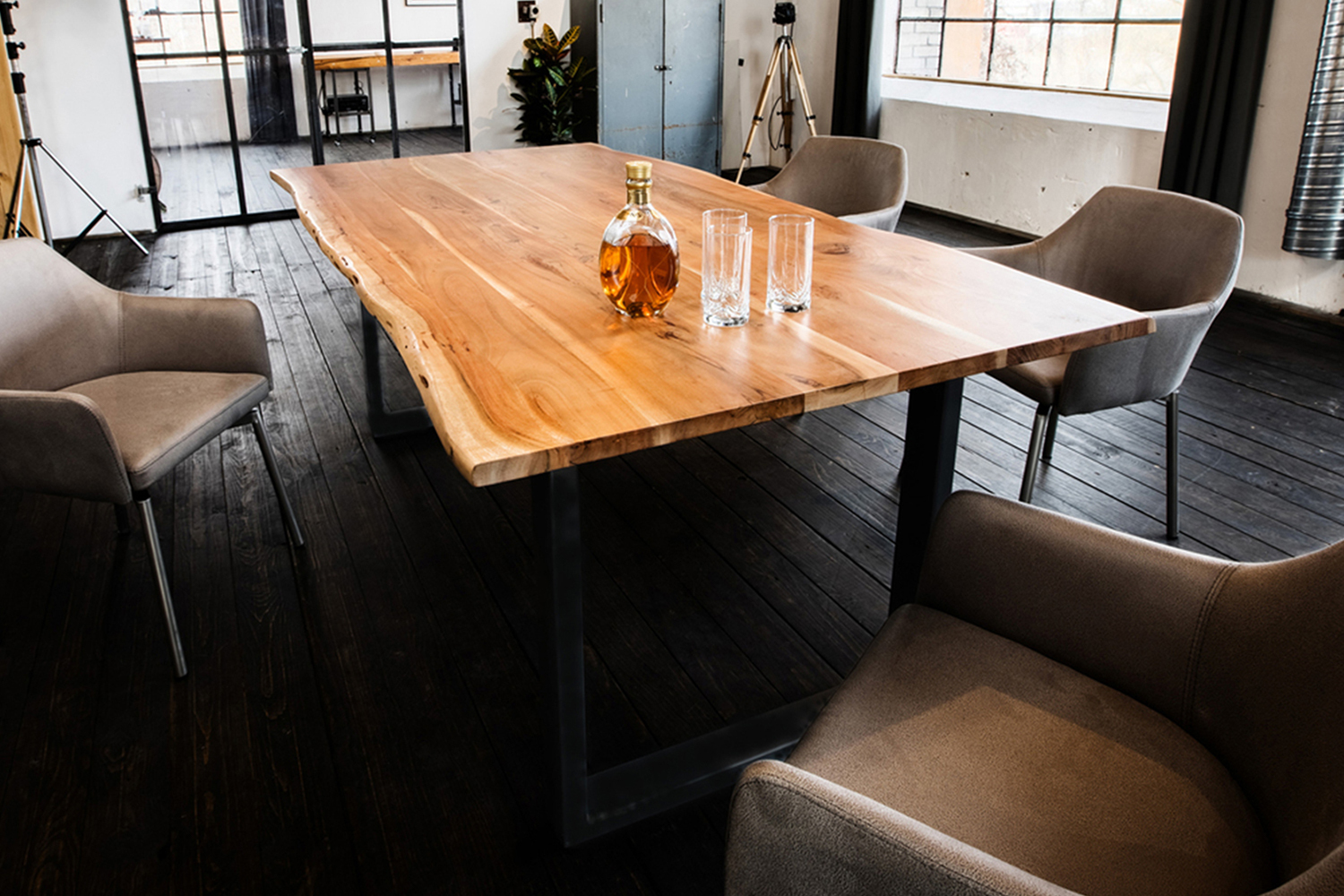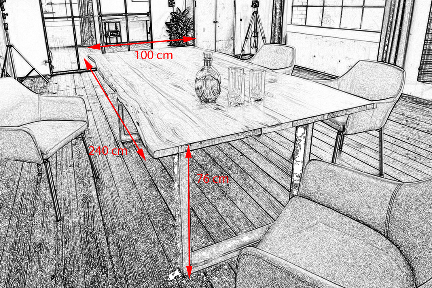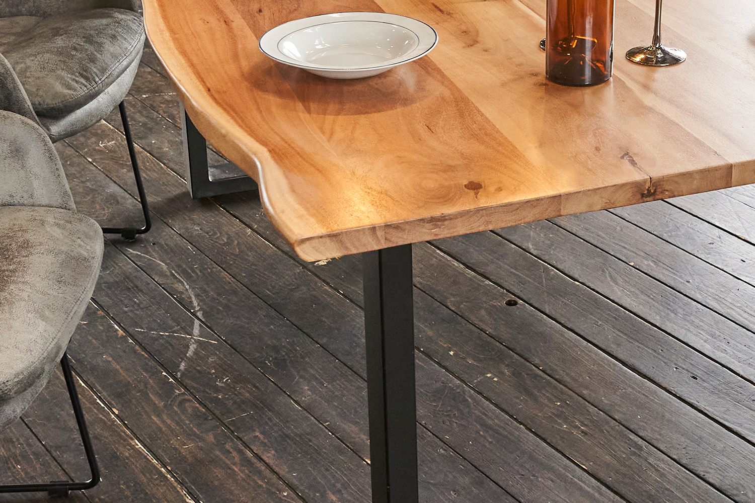 Wunderschöner Esstisch, mit Massivholzplatte, der sich wunderbar in das moderne, aber auch das rustikal gemütliche Wohnambiente integrieren lässt. Besonderes Highlight des Esstisches sind die Tischkanten, die den natürlichen Formen eines Baumes entsprechen. Das kubische Metallgestell bildet hierzu einen gelungenen Kontrast, der dem Massivholz Esstisch einen Hauch industriellen Charme verleiht.WICHTIGER HINWEIS