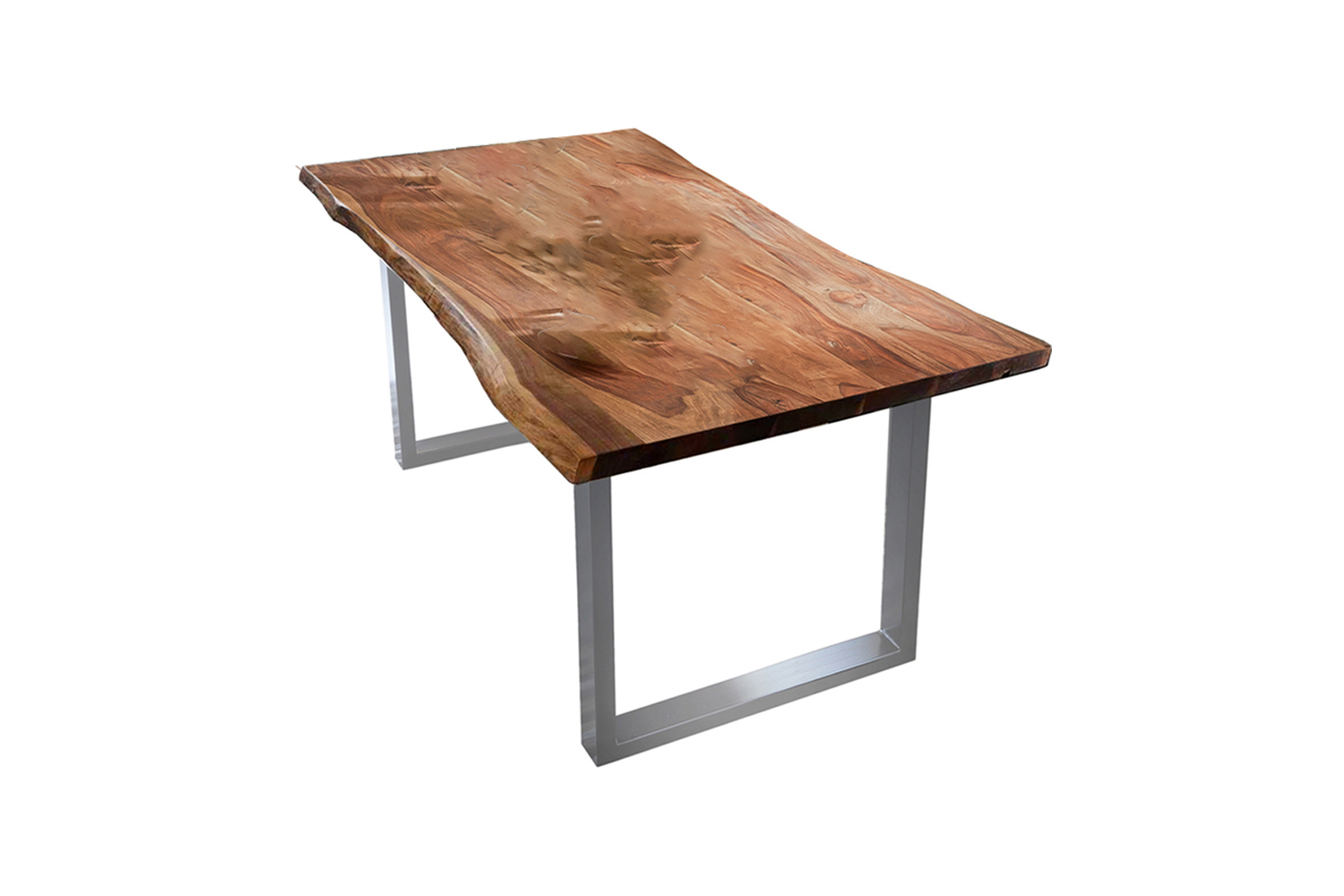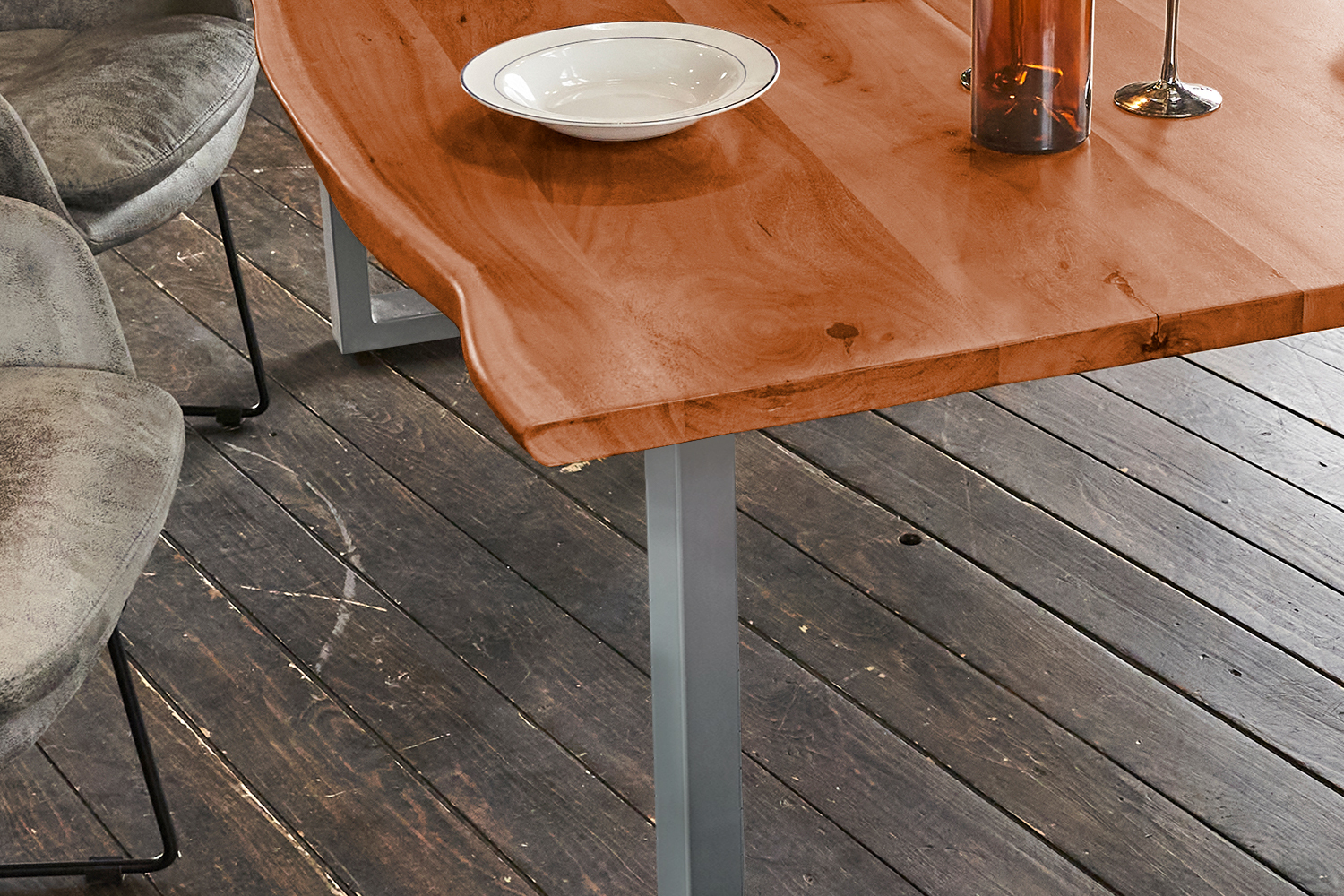 Wunderschöner Esstisch, mit Massivholzplatte, der sich wunderbar in das moderne, aber auch das rustikal gemütliche Wohnambiente integrieren lässt. Besonderes Highlight des Esstisches sind die Tischkanten, die den natürlichen Formen eines Baumes entsprechen. Das kubische Metallgestell bildet hierzu einen gelungenen Kontrast, der dem Massivholz Esstisch einen Hauch industriellen Charme verleiht.WICHTIGER HINWEIS