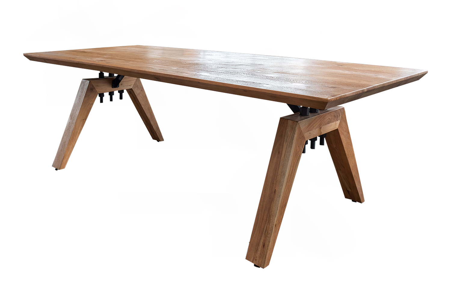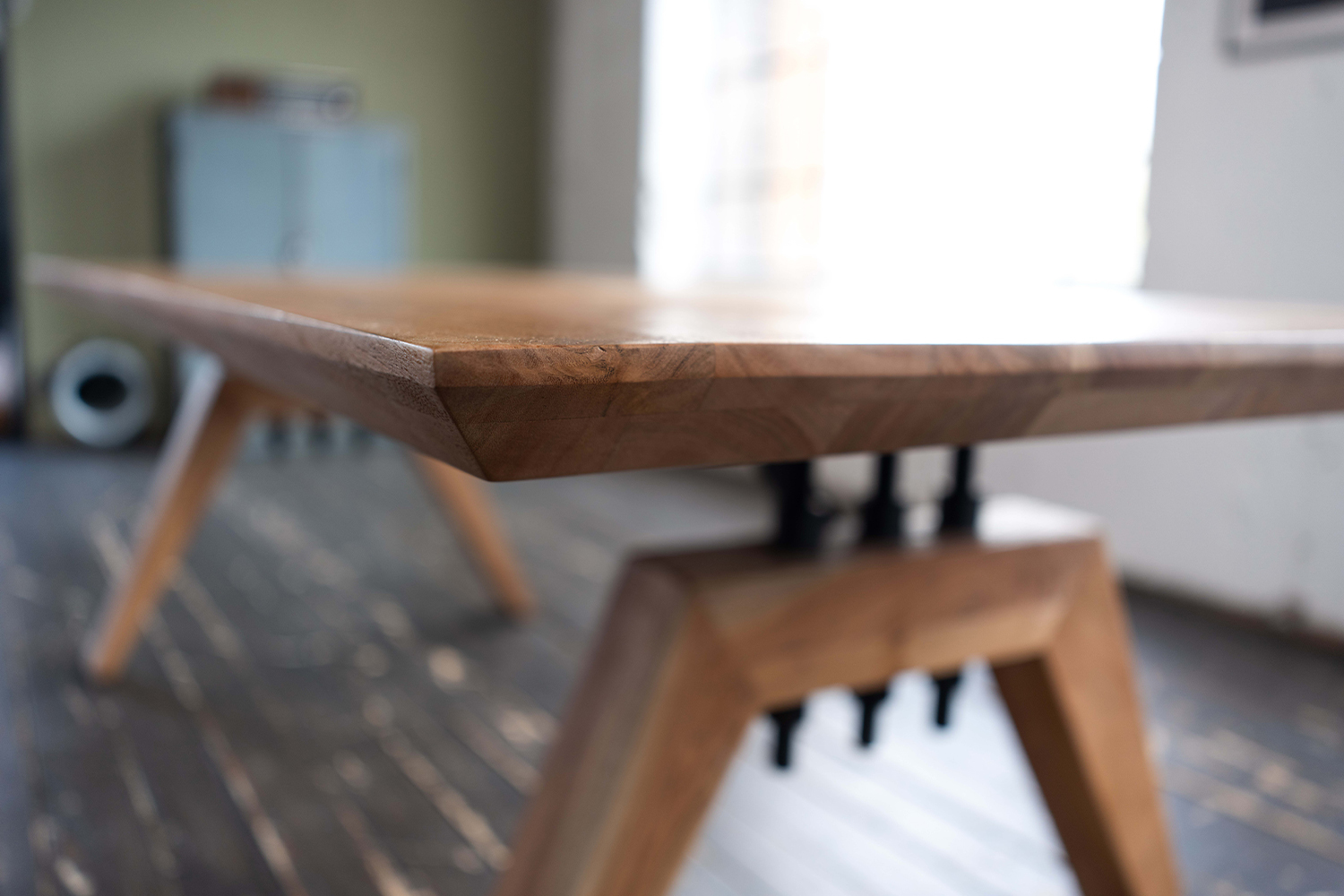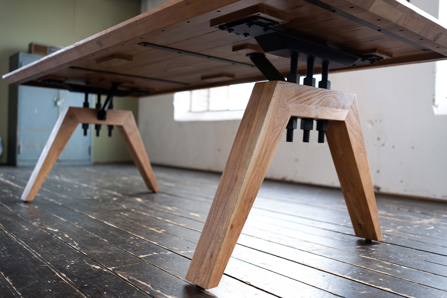 Das rustikal geschweißte, schwarz lackierte Untergestell im Industriedesign verleiht dem Tisch eine moderne, industrielle Note. Diese gelungene Kombination aus natürlichem Holz und robustem Metall macht den Tisch zu einem Design-Highlight in Ihrem Esszimmer.