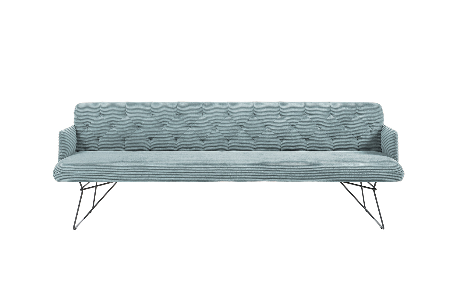 Durch den legeren Sitzaufbau ist eine modellbedingte und gestalterisch gewünschte Wellenbildung warentypisch und unterstreicht den gemütlichen Faktor der Sitzbank. Die behagliche Polsterung wird durch den weichen Bezug aus angesagtem Cord-Stoff noch einmal zusätzlich unterstrichen, sodass auch die Haptik der Bank gemütlich und kuschelig erscheint.