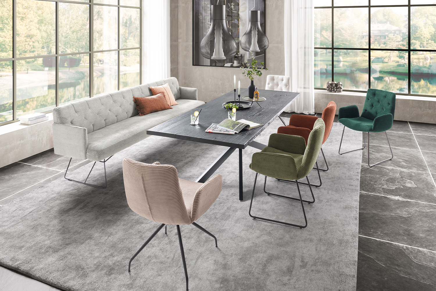 Da die Esszimmerbank CHARME rundum mit Stoff bezogen ist, kann sie auch frei in den Raum gestellt werden. Die Polsterbank fügt sich durch ihre Drahtfüße und den stilvollen Cordbezug passend in Ihr Zuhause ein. Auf der Bank finden bis zu vier Personen Platz, die uneingeschränkten Sitzkomfort genießen können.