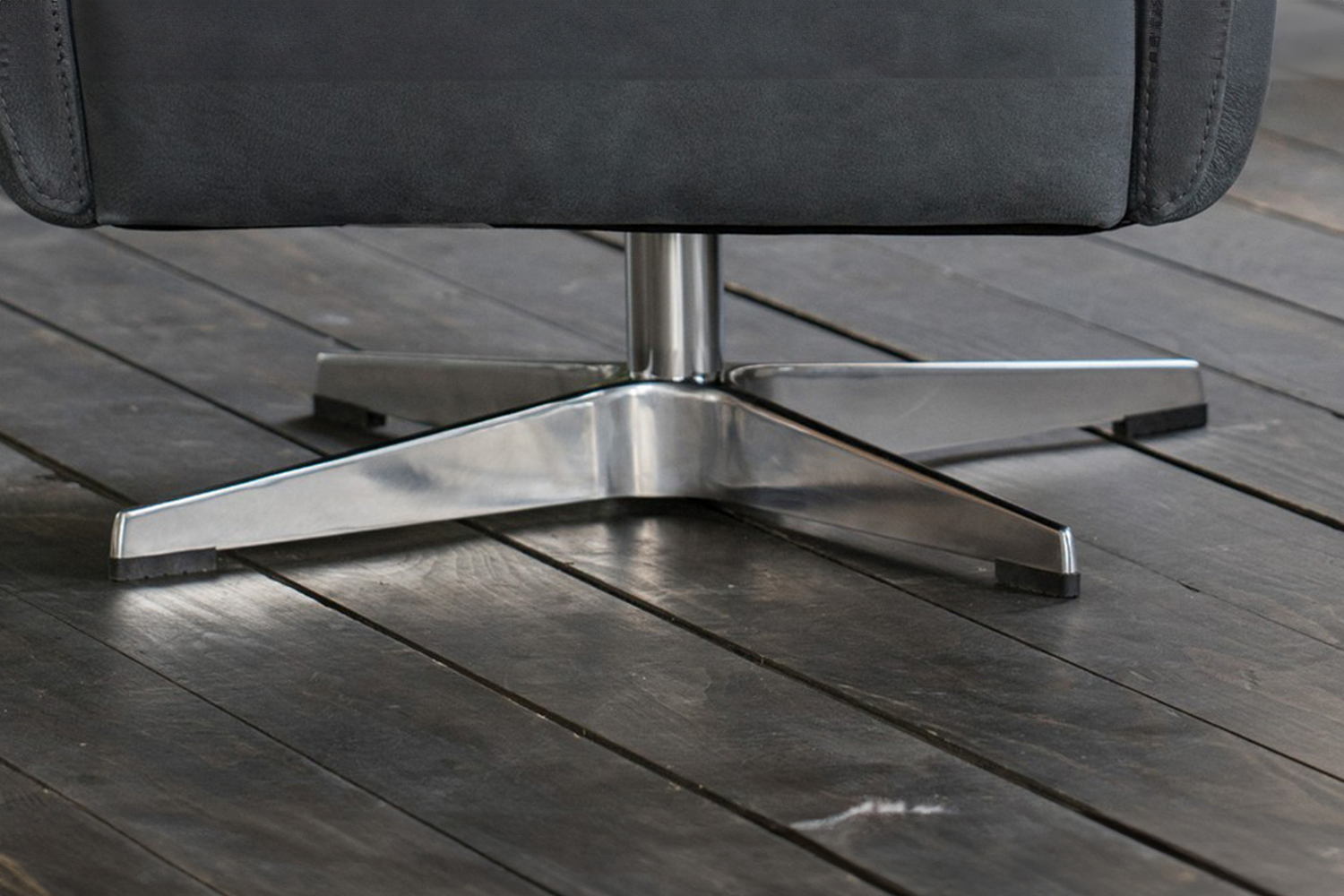 Der Drehsessel wurde komplett in einem wunderschönen schwarzen Leder überzogen, welches hervorragend zur Form und zur Wahl der Füße passt. Der Fuß wurde hier als Kreuzfuß Metall gefertigt.