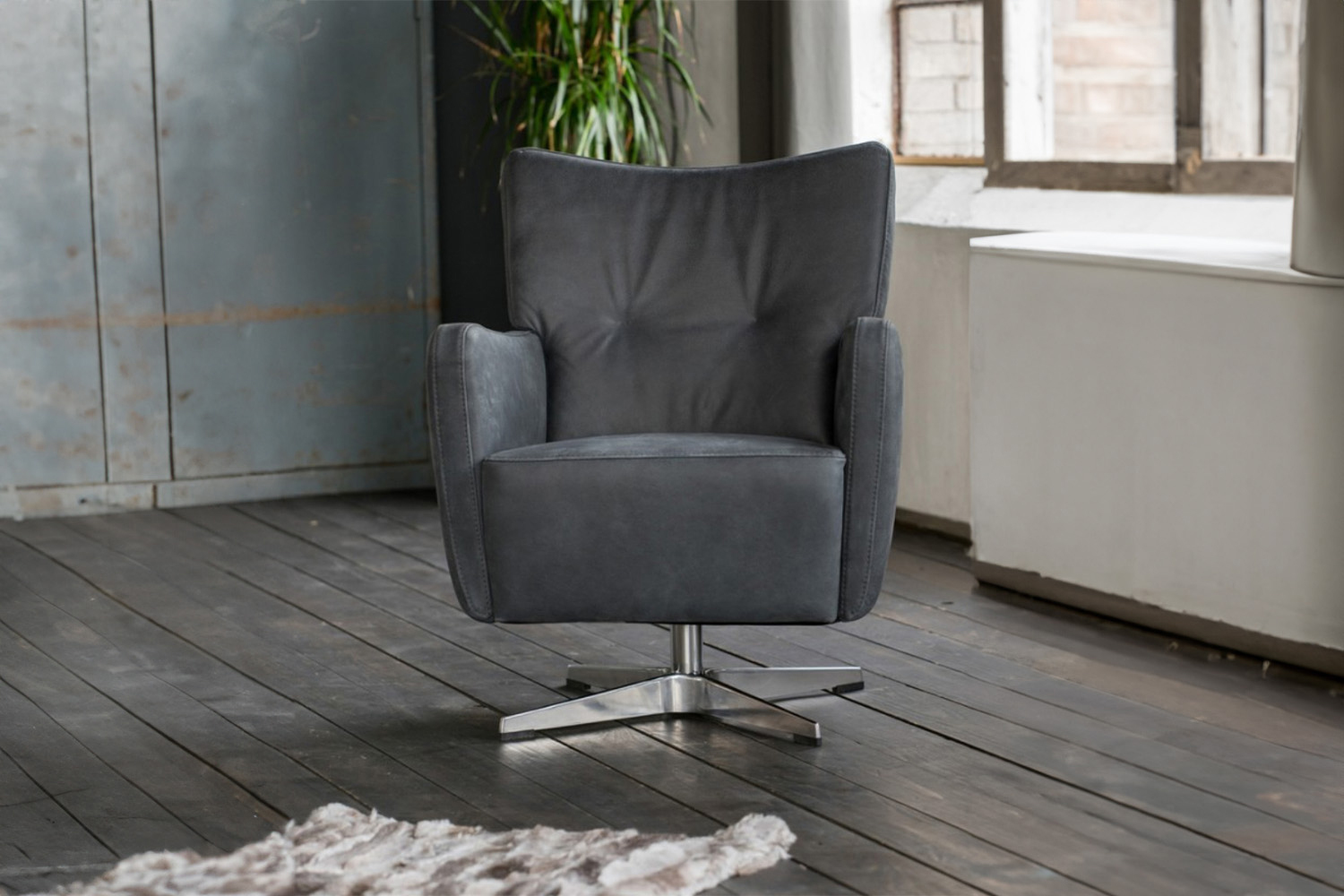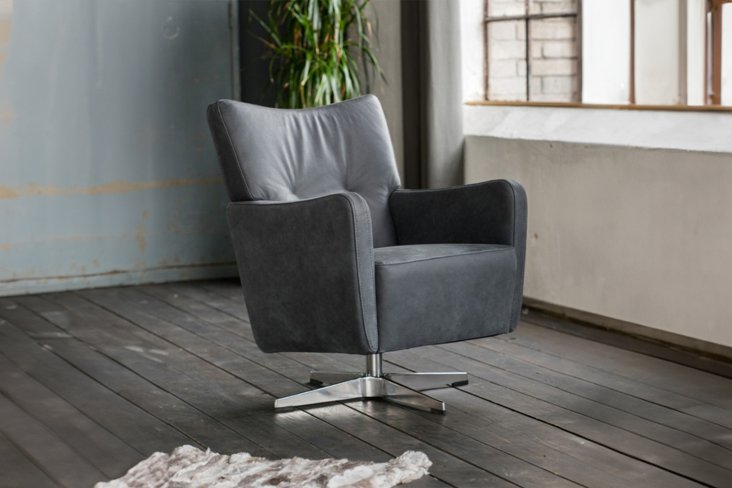 Bedingt durch die Gradlinigkeit und der Wahl des Bezuges kann der Drehsessel in jedes Wohnambiente oder auch Arbeitszimmer integriert werden.