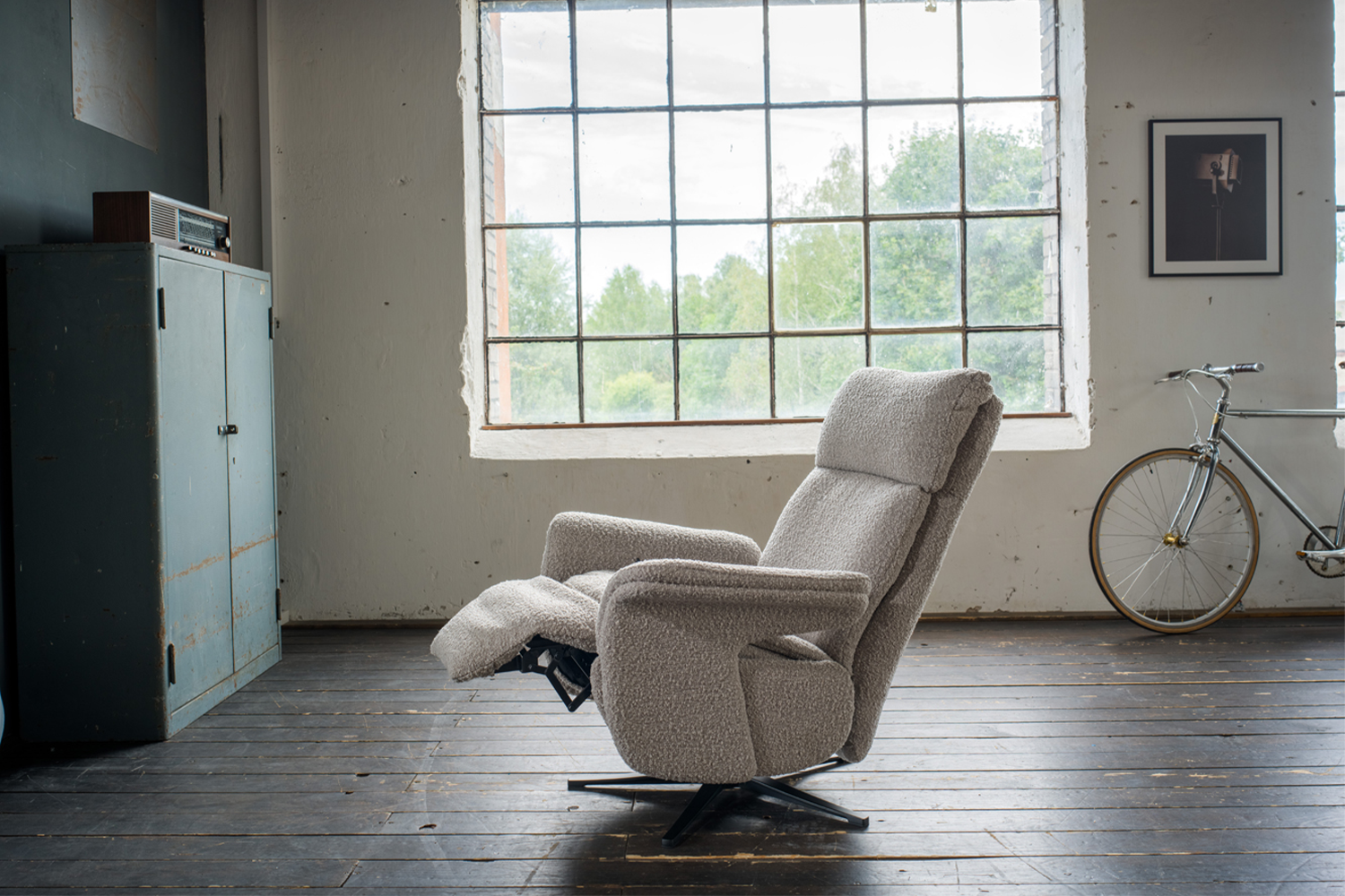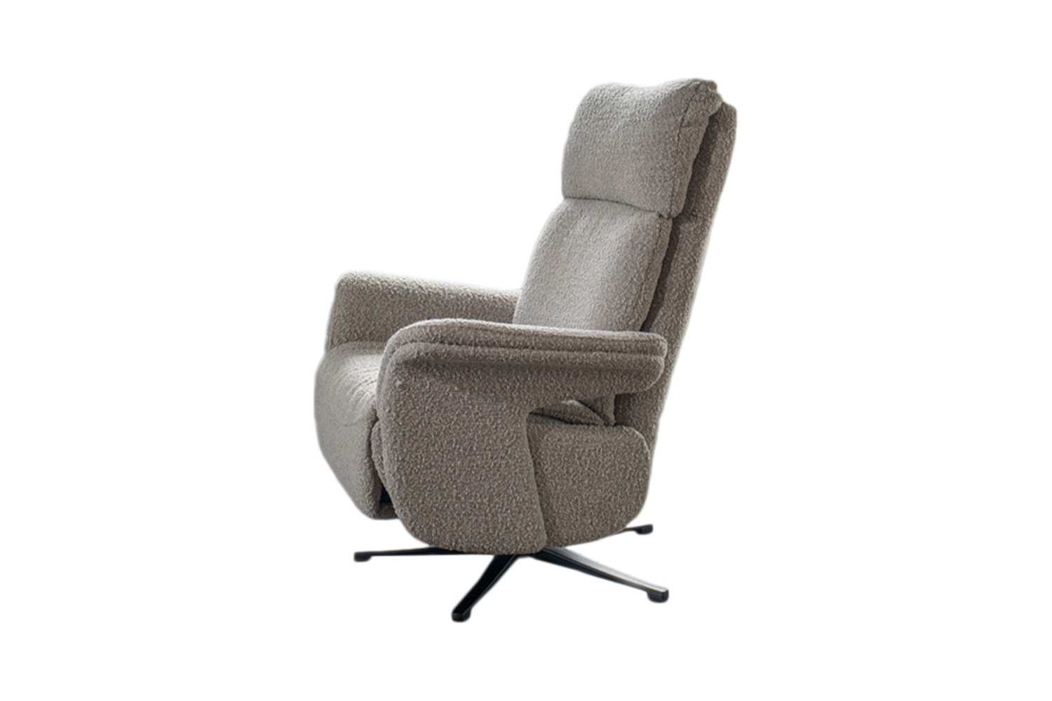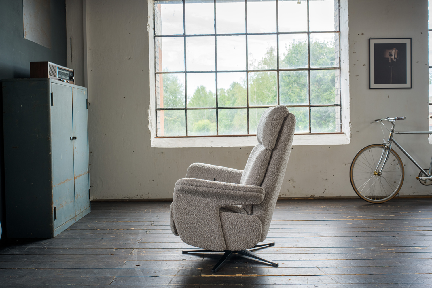 Erleben Sie mit dem Relaxsessel NAMA unvergleichlichen Komfort und verwandeln Sie Ihr Wohnzimmer in eine Wohlfühloase. Dieser bequeme Fernsehsessel mit Bezug aus hochwertigem Bouclé-Stoff besticht durch seine manuell verstellbare Relaxfunktion, die es Ihnen ermöglicht, die Sitzposition ganz nach Ihren Bedürfnissen anzupassen. Durch einen seitlichen Hebel lässt sich der Sessel in jeder gewünschten Position fixieren, während die Fußstütze sich durch sanften Druck ausfährt und eine angenehme Liegeposition ermöglicht. Ein weiteres Highlight ist die 360° Drehfunktion, die Ihnen maximale Bewegungsfreiheit bietet. Die verstellbare Kopfstütze sorgt für zusätzlichen Komfort und Unterstützung im Nackenbereich.