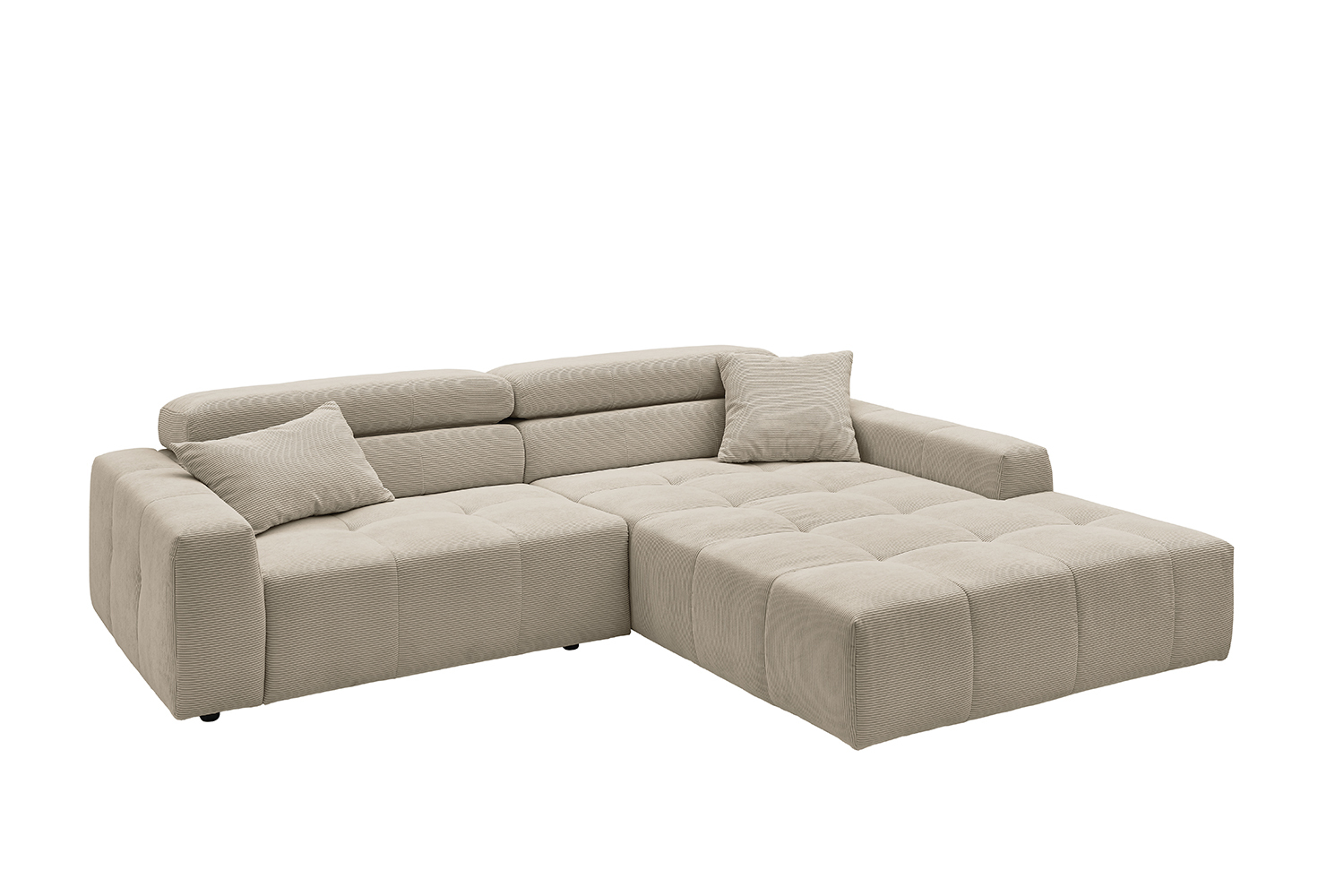 Entdecken Sie das stilvolle Ecksofa RENO von KAWOLA, das mit seinem hochwertigen Cordbezug und seiner raffinierten Kopfteilverstellung beeindruckt. Der Rundumbezug aus erstklassigem Cord verleiht diesem Ecksofa einen zeitlosen Charme und eine angenehme Haptik. Der ergonomisch geformte Rücken aus Schaumstoff sorgt für zusätzlichen Komfort, während die Wellenunterfederung und der PUR-Schaum im Sitzbereich ein angenehmes Sitzgefühl gewährleisten. Die innovative Kopfteilverstellung ermöglicht es Ihnen, die Kopfteile individuell zu neigen oder aufrecht zu stellen, um Ihre persönliche Entspannungsposition zu finden. Mit einem mittelfesten Sitzkomfort bietet das Ecksofa RENO die perfekte Kombination aus Stil und Gemütlichkeit. Erleben Sie pure Entspannung in Ihrem Wohnzimmer mit diesem bequemen und ansprechenden Möbelstück.