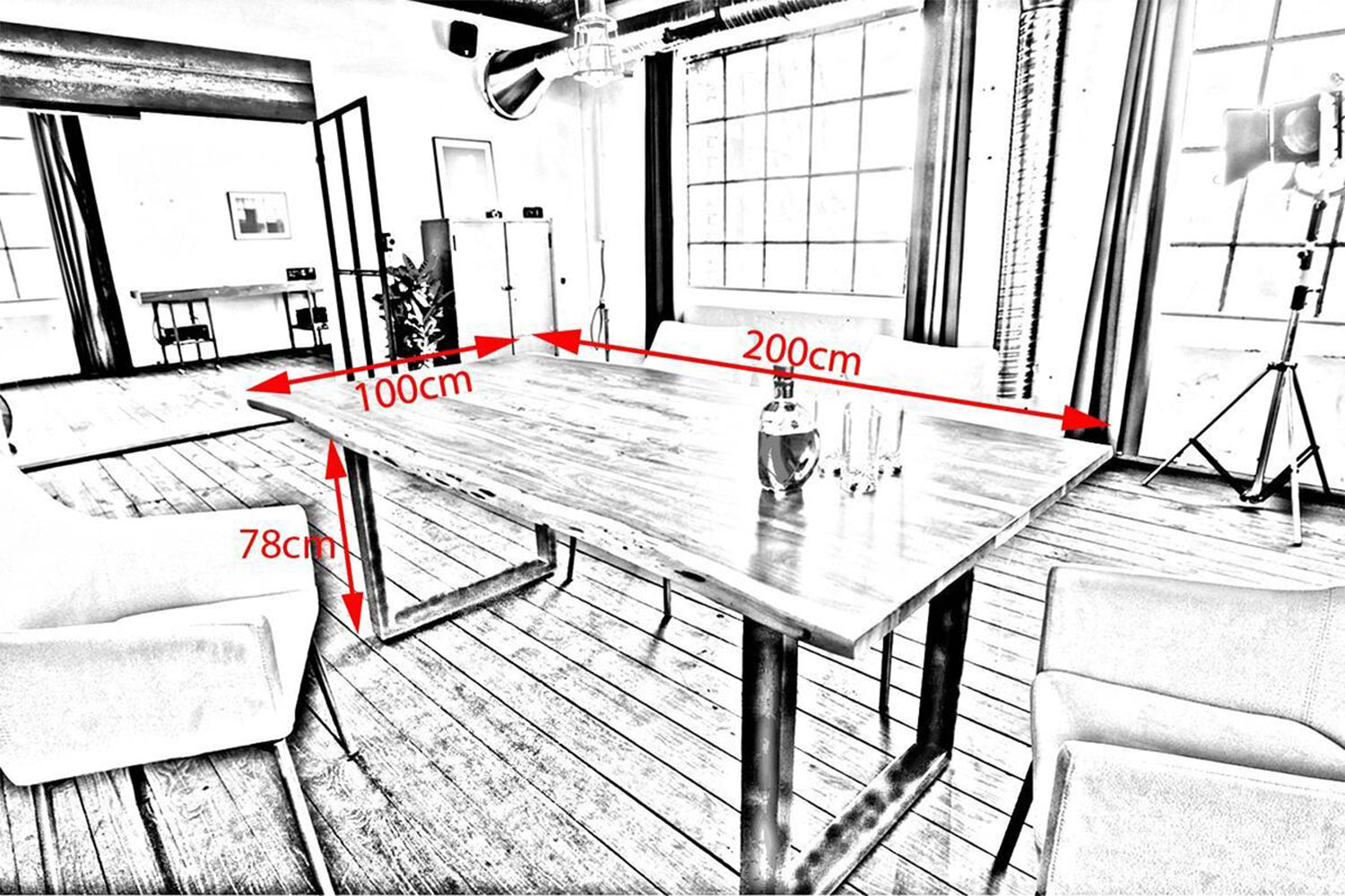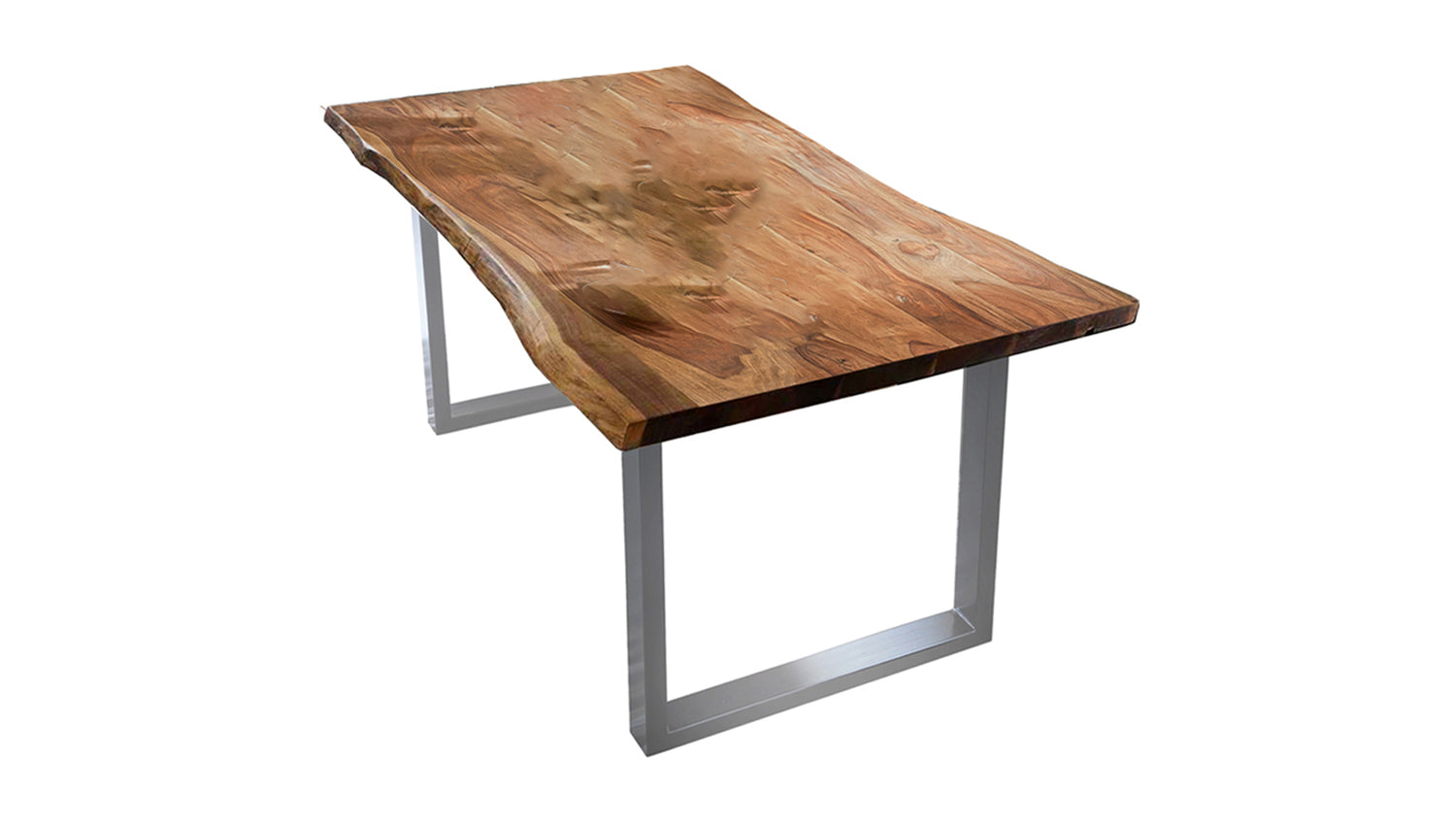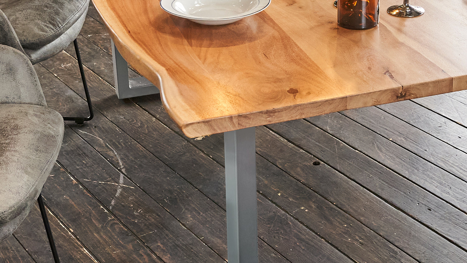 Wunderschöner Esstisch, mit Massivholzplatte, der sich wunderbar in das moderne, aber auch das rustikal gemütliche Wohnambiente integrieren lässt. Besonderes Highlight des Esstisches sind die Tischkanten, die den natürlichen Formen eines Baumes entsprechen. Das kubische Metallgestell bildet hierzu einen gelungenen Kontrast, der dem Massivholz Esstisch einen Hauch industriellen Charme verleiht. WICHTIGER HINWEIS Bei diesem Baumkantentisch handelt es sich um ein Naturprodukt. Das macht ihn zu einem Unikat, jeder Tisch ist einzigartig. Maßabweichungen, Astlöcher und Risse sowie kleinere Unebenheiten sind warentypisch und kein Reklamationsgrund. Vorhandene Risse werden noch in der Herstellung mit Stücken der gleichen Holzart ausgefüllt. Daraus resultierende farbliche Abweichungen stellen ebenfalls keinen Reklamationsgrund dar.