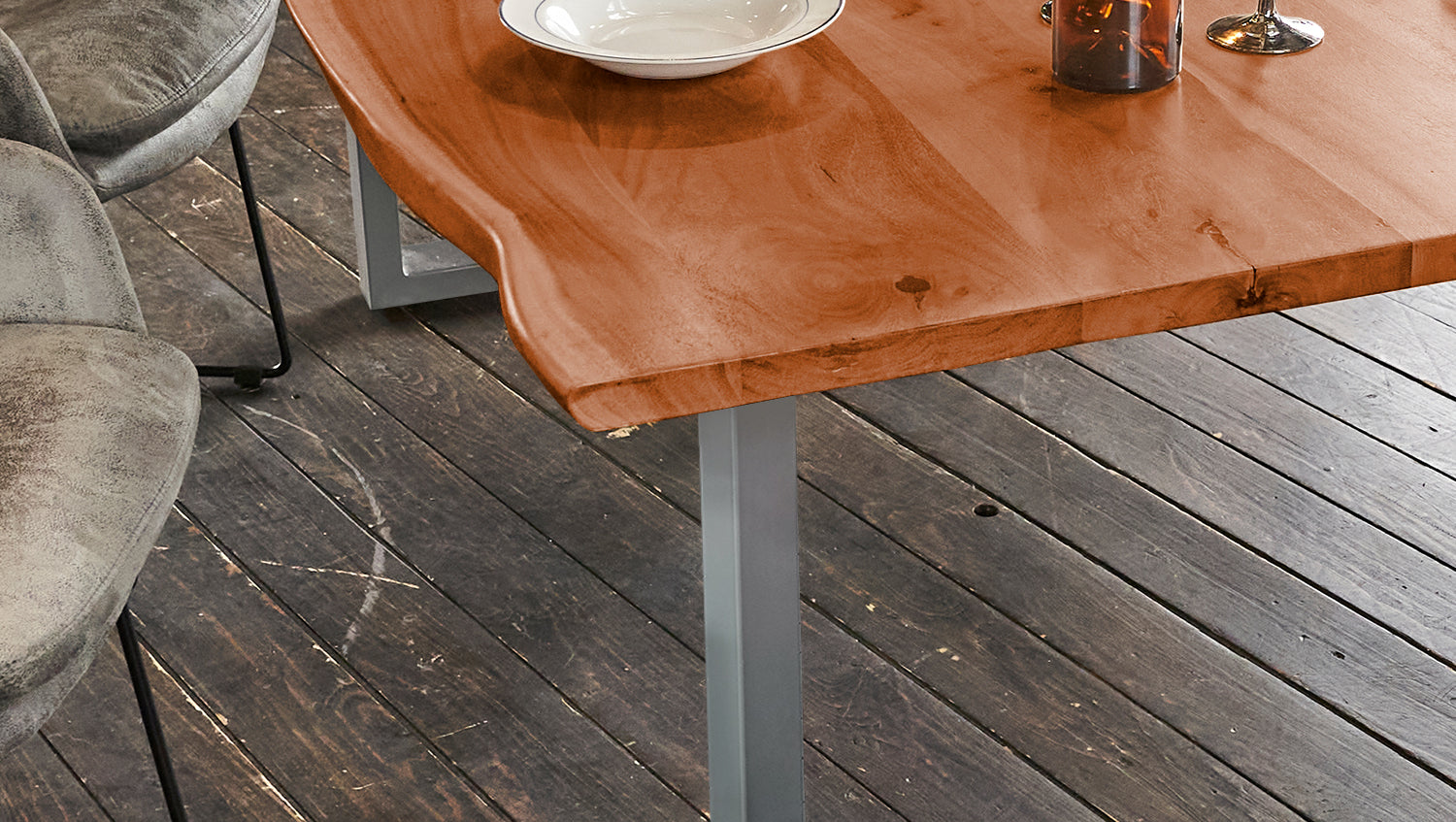 Wunderschöner Esstisch, mit Massivholzplatte, der sich wunderbar in das moderne, aber auch das rustikal gemütliche Wohnambiente integrieren lässt. Besonderes Highlight des Esstisches sind die Tischkanten, die den natürlichen Formen eines Baumes entsprechen. Das kubische Metallgestell bildet hierzu einen gelungenen Kontrast, der dem Massivholz Esstisch einen Hauch industriellen Charme verleiht.