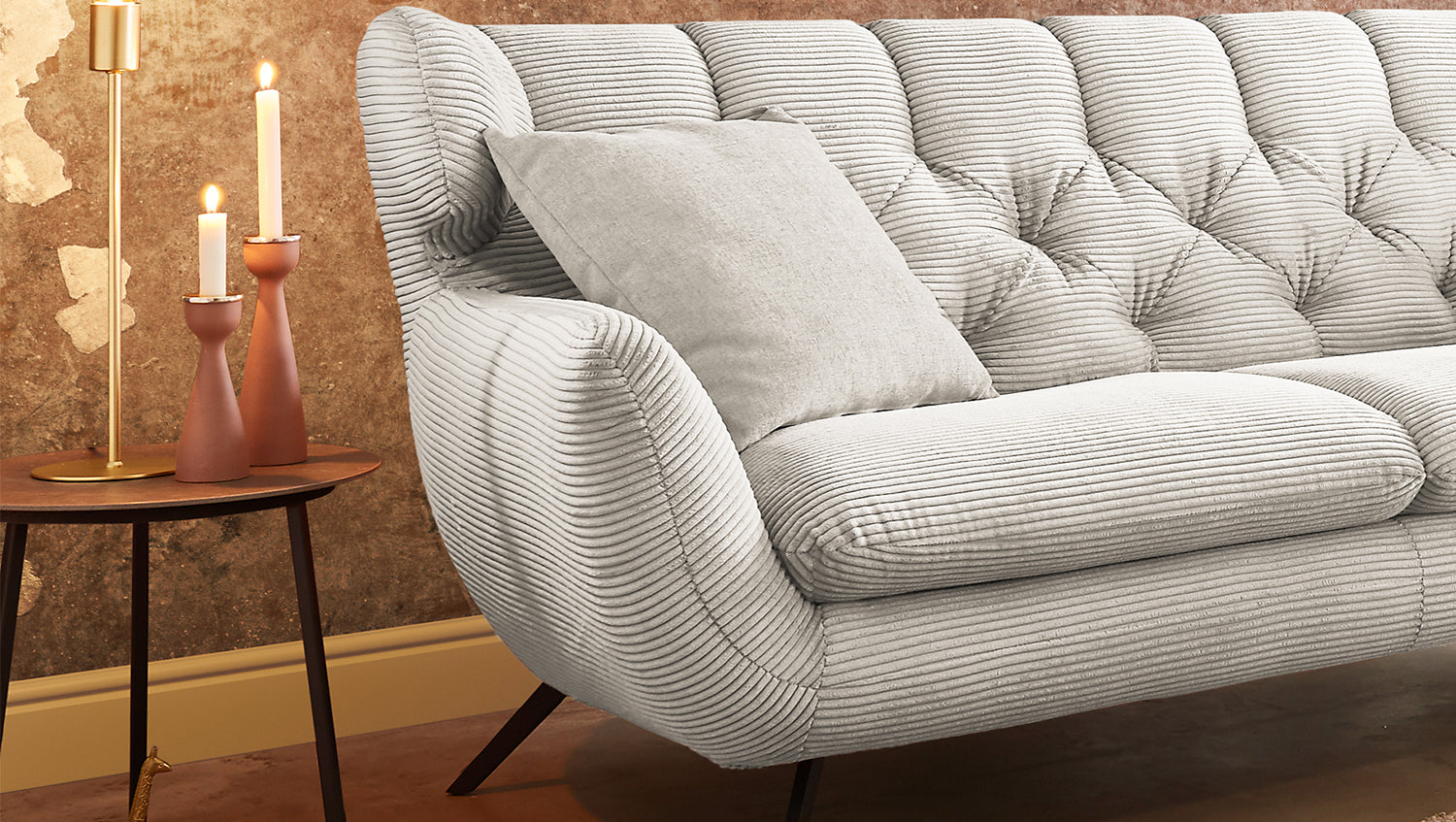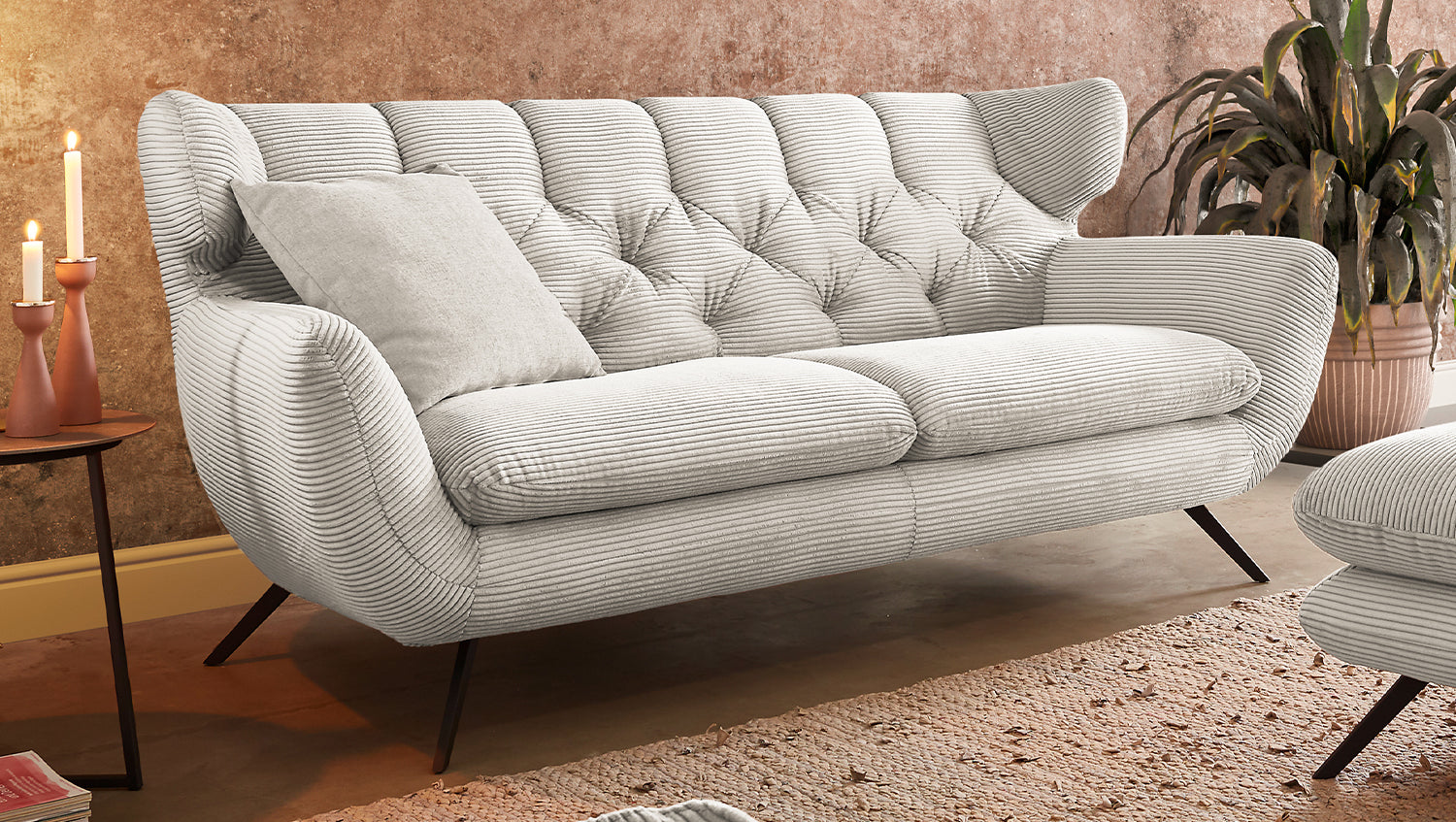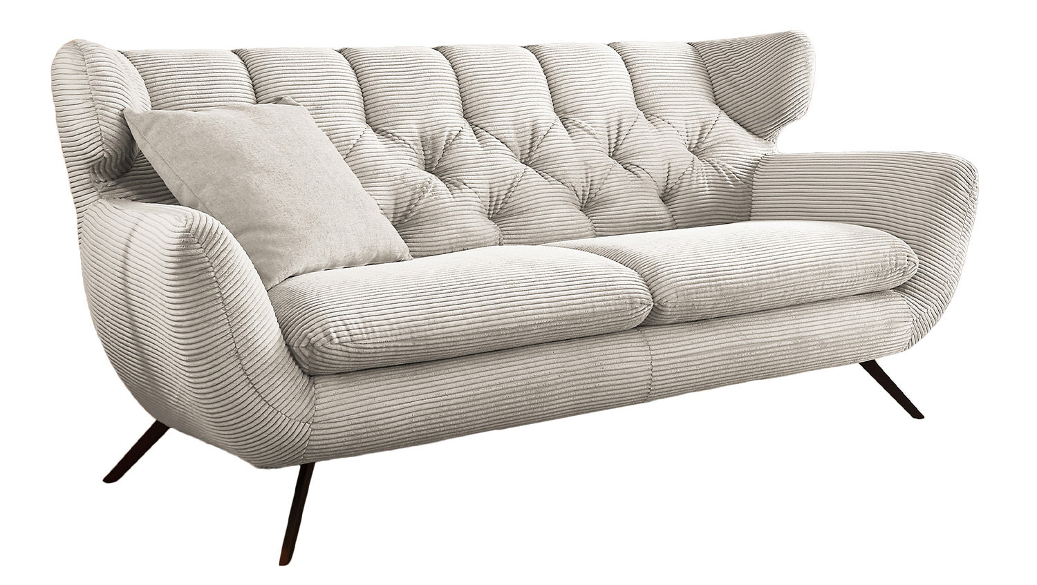 Das KAWOLA Sofa CHARME ist etwas ganz Besonderes! Es ist nicht nur ein Möbelstück, sondern ein wahres Design-Highlight, das neue Akzente im Wohnraum setzt. Der Stil des Sofas CHARME erinnert an die sechziger Jahre: Der Rücken wurde aufwendig abgesteppt ohne Knöpfe; die Rückenlehne wurde an den beiden Seiten leicht nach vorne gewölbt und erinnert an die Form eines Ohrensessels; die Füße aus Metall sind leicht ausgestellt. Die Polsterung des Sofas besteht aus PUR-Schaum und besticht durch ihren weichen und legeren Sitzkomfort. Die Sitzkissen passen sich der Körperform angenehm an. Selbstverständlich wurde das Sofa komplett in Cord bezogen, so dass es auch frei in den Raum gestellt werden kann. Wer nicht nur ein Sofa sucht, sondern ein ganz besonderes Highlight, der liegt mit dem KAWOLA Sofa CHARME goldrichtig!