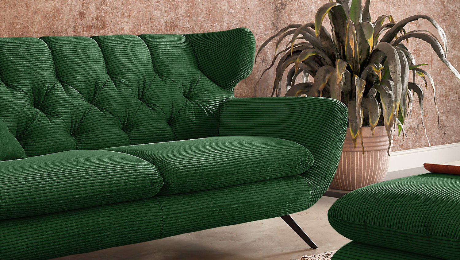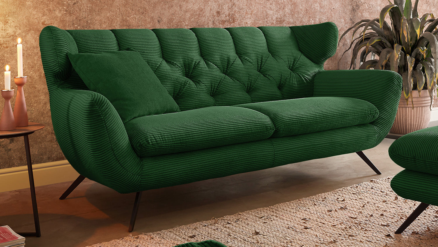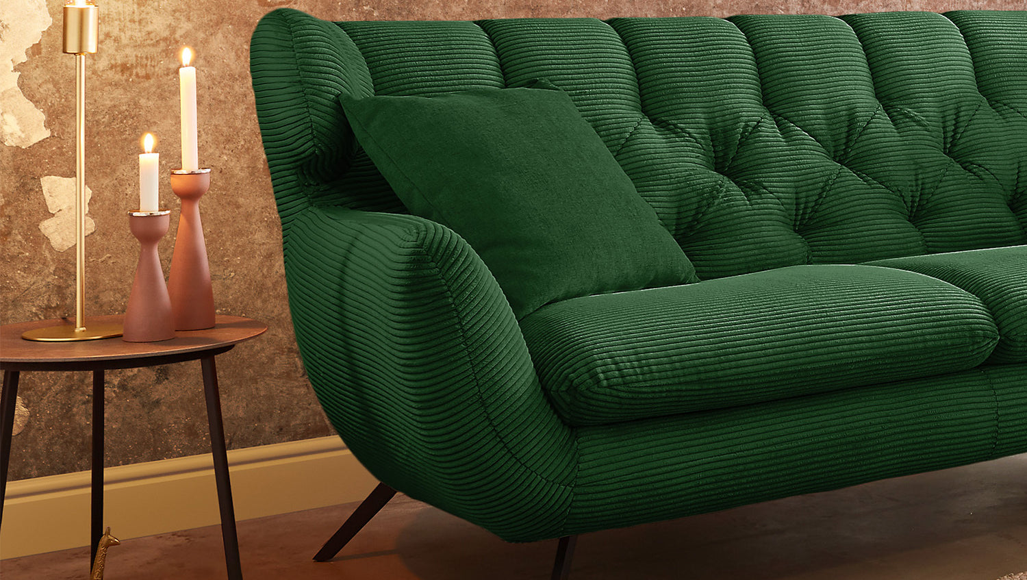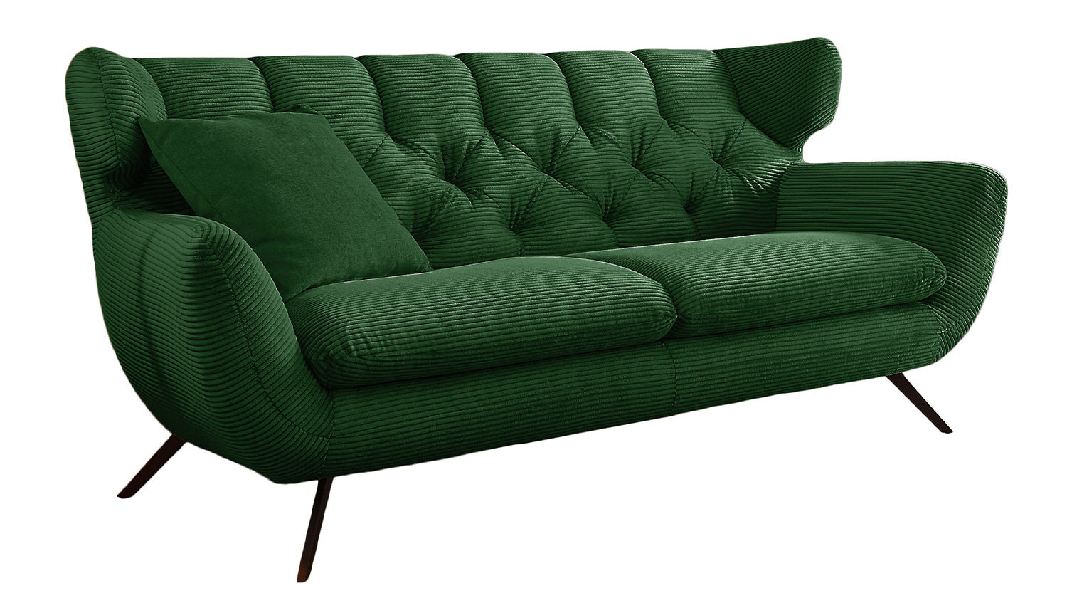 Das KAWOLA Sofa CHARME ist etwas ganz Besonderes! Es ist nicht nur ein Möbelstück, sondern ein wahres Design-Highlight, das neue Akzente im Wohnraum setzt. Der Stil des Sofas CHARME erinnert an die sechziger Jahre: Der Rücken wurde aufwendig abgesteppt ohne Knöpfe; die Rückenlehne wurde an den beiden Seiten leicht nach vorne gewölbt und erinnert an die Form eines Ohrensessels; die Füße aus Metall sind leicht ausgestellt. Die Polsterung des Sofas besteht aus PUR-Schaum und besticht durch ihren weichen und legeren Sitzkomfort. Die Sitzkissen passen sich der Körperform angenehm an. Selbstverständlich wurde das Sofa komplett in Cord bezogen, so dass es auch frei in den Raum gestellt werden kann. Wer nicht nur ein Sofa sucht, sondern ein ganz besonderes Highlight, der liegt mit dem KAWOLA 3-Sitzer CHARME goldrichtig!
