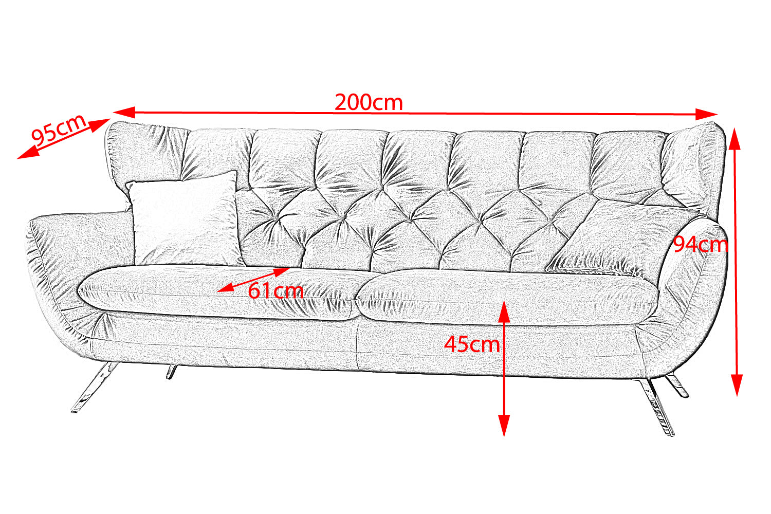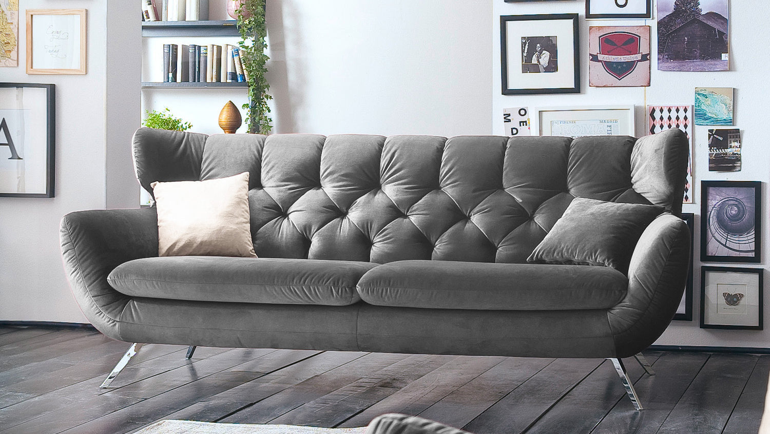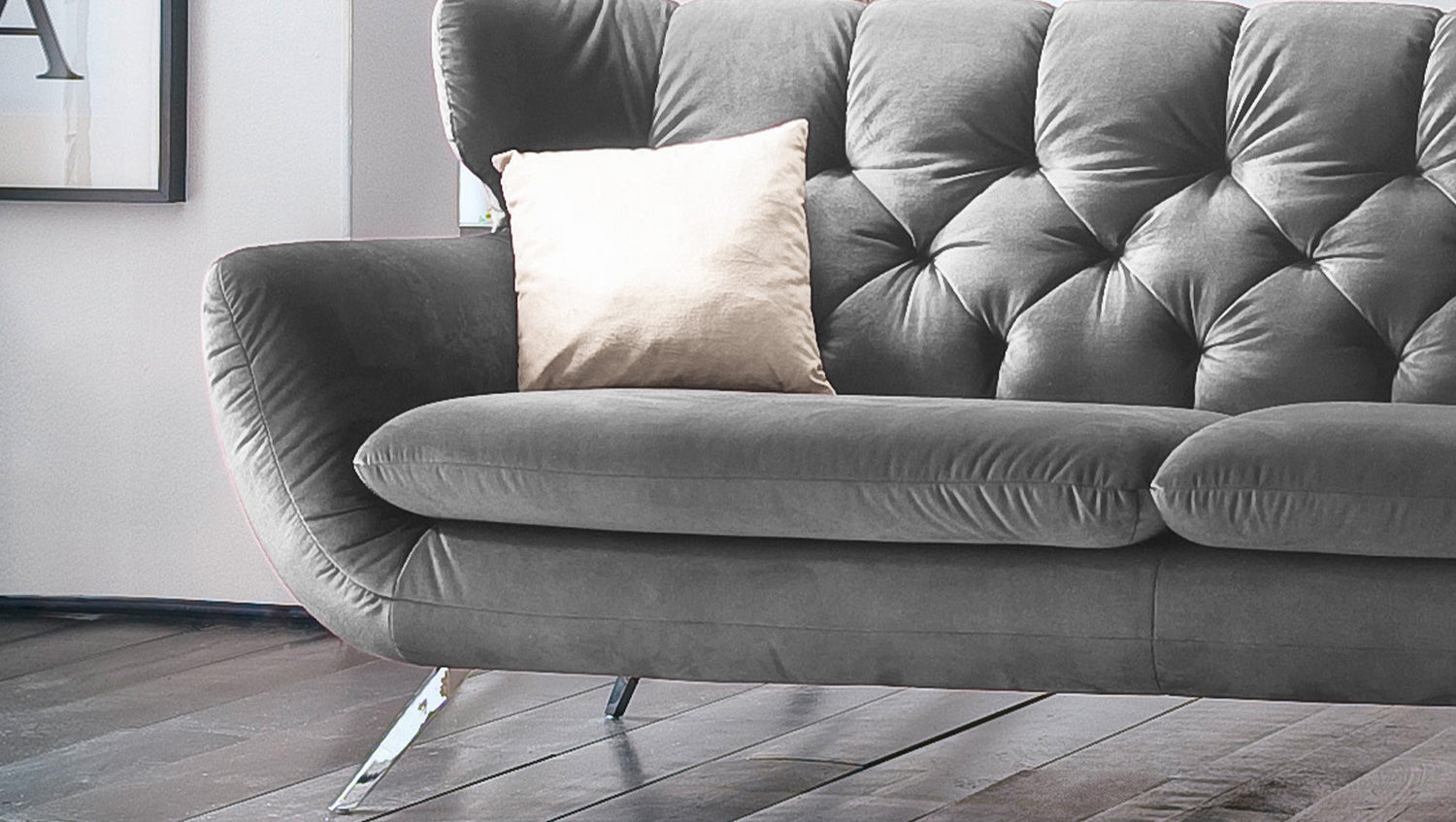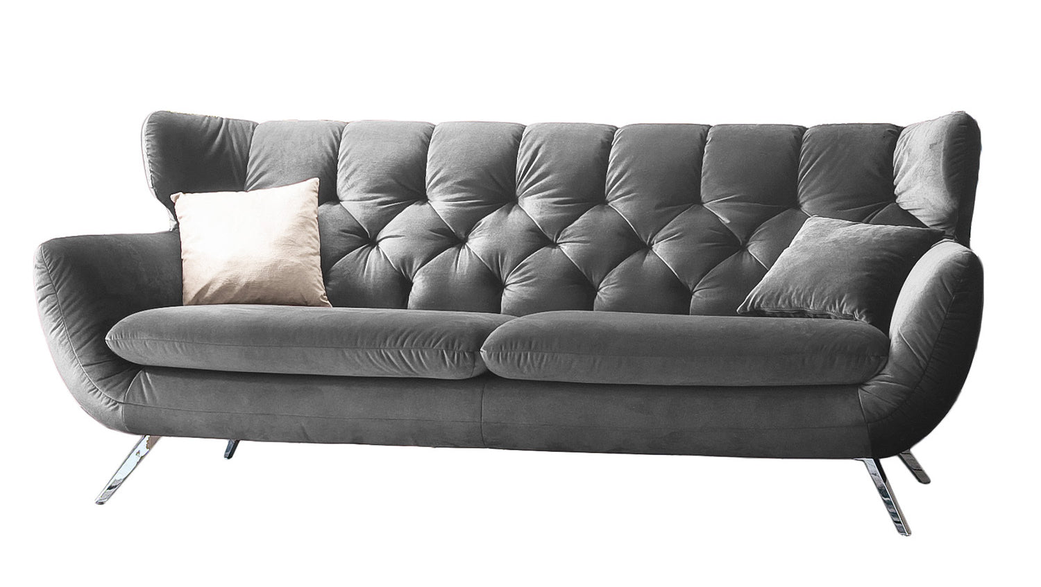 Der Stil des Sofas CHARME erinnert an die sechziger Jahre: Der Rücken wurde aufwendig abgesteppt ohne Knöpfe; die Rückenlehne wurde an den beiden Seiten leicht nach vorne gewölbt und erinnert an die Form eines Ohrensessels; die Füße aus Metall sind leicht ausgestellt.