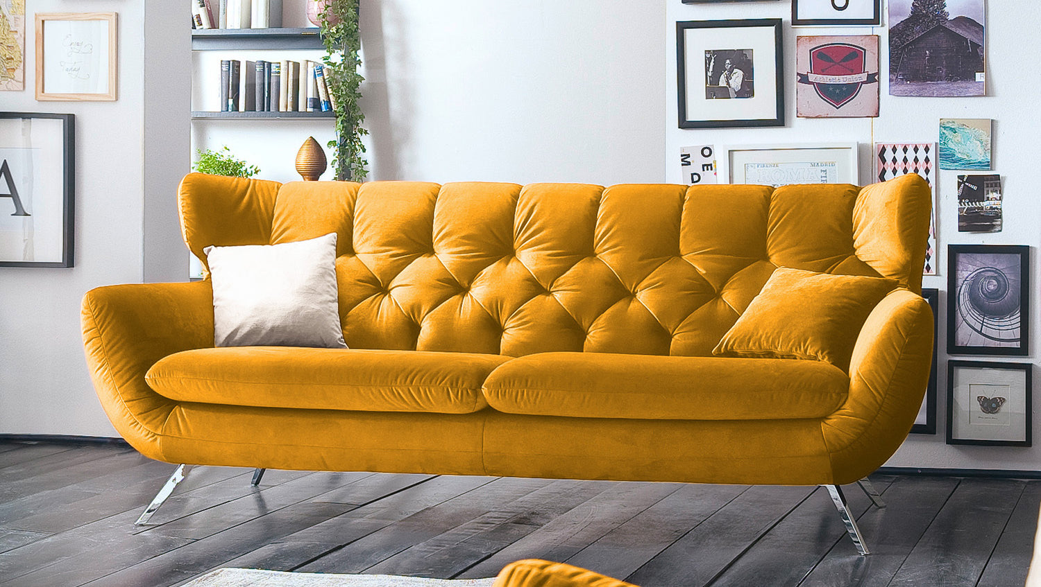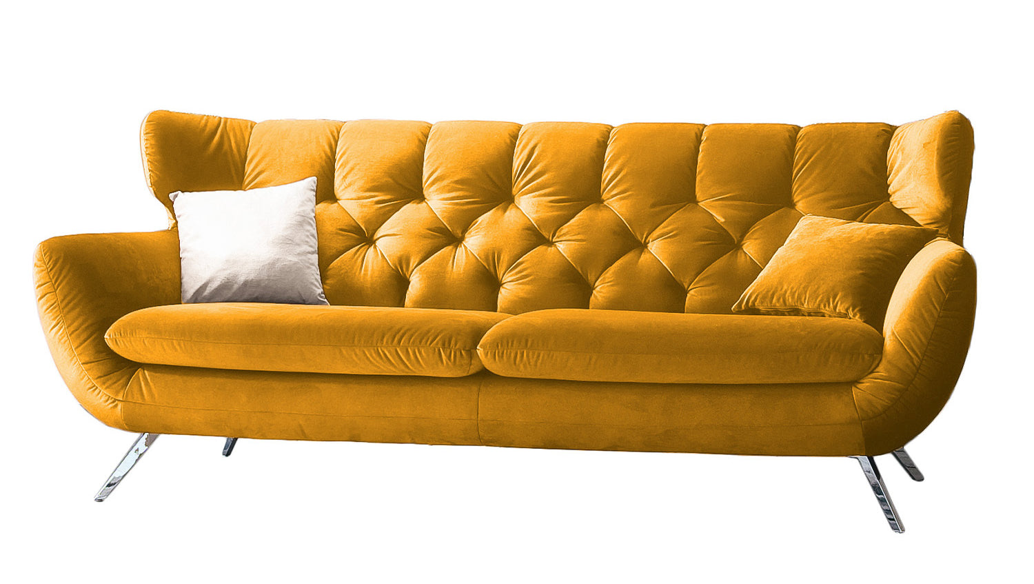 Das KAWOLA Sofa CHARME ist etwas ganz Besonderes! Es ist nicht nur ein Möbelstück, sondern ein wahres Design-Highlight, das neue Akzente im Wohnraum setzt. Der Stil des Sofas CHARME erinnert an die sechziger Jahre: Der Rücken wurde aufwendig abgesteppt ohne Knöpfe; die Rückenlehne wurde an den beiden Seiten leicht nach vorne gewölbt und erinnert an die Form eines Ohrensessels; die Füße aus Metall sind leicht ausgestellt. Die Polsterung des Sofas besteht aus PUR-Schaum und besticht durch ihren weichen und legeren Sitzkomfort. Die Sitzkissen passen sich der Körperform angenehm an. Selbstverständlich wurde das Sofa komplett in Velvet bezogen, so dass es auch frei in den Raum gestellt werden kann. Wer nicht nur ein Sofa sucht, sondern ein ganz besonderes Highlight, der liegt mit dem KAWOLA Sofa CHARME goldrichtig!