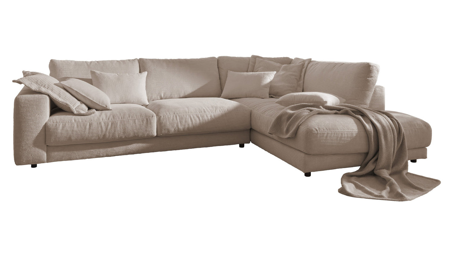 Das KAWOLA Ecksofa MADELINE besticht durch seinen hervorragenden Sitzkomfort, der durch die äußerst legere Polsterung zustande kommt und zum Verweilen und Entspannen einlädt. Die Polsterung passt sich der Körperform an; Sitzabdrücke sowie Wellenbildung der Bezüge sind warentypisch. Der Sitz besteht aus einer Unterfederung mit dauerelastischen Stahl-Wellenfedern und einer oberseitigen Abdeckung sowie losen Sitzkissen aus PUR-Schaum. Sitz und Rücken sind abgedeckt mit einem Inlett, welches befüllt ist mit hochwertigen Füllstoffen, die eine Beimischung von Federn enthalten. Der Bezug aus trendigem Cord-Stoff verleiht dem Big Sofa eine zeitlose Eleganz. Wenn Sie Ihrem Wohnzimmer einen außergewöhnlichen Anstrich verleihen wollen, ist das Sofa MADELINE definitiv das Richtige für Sie!