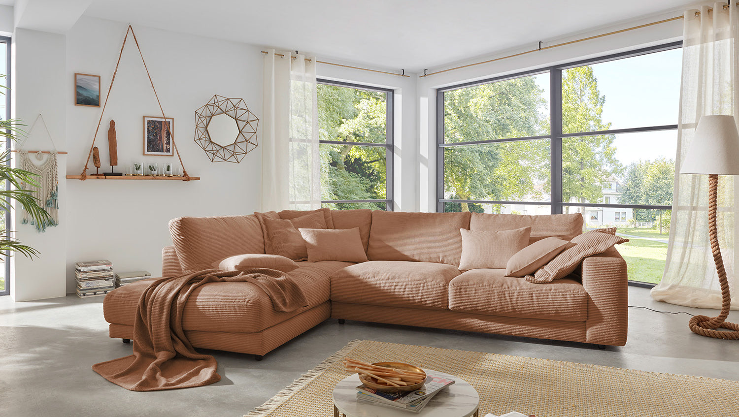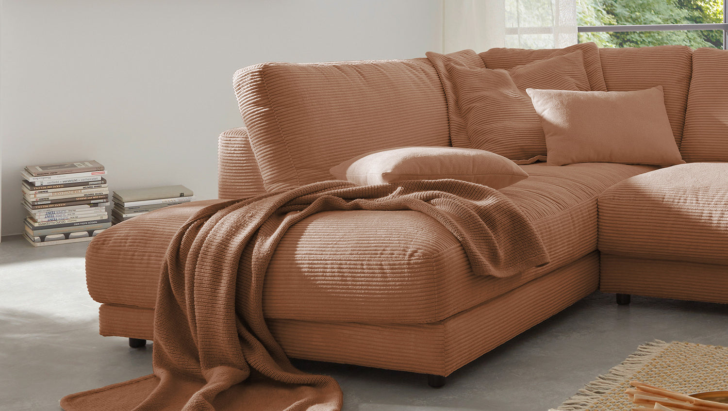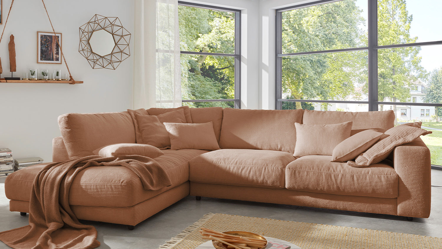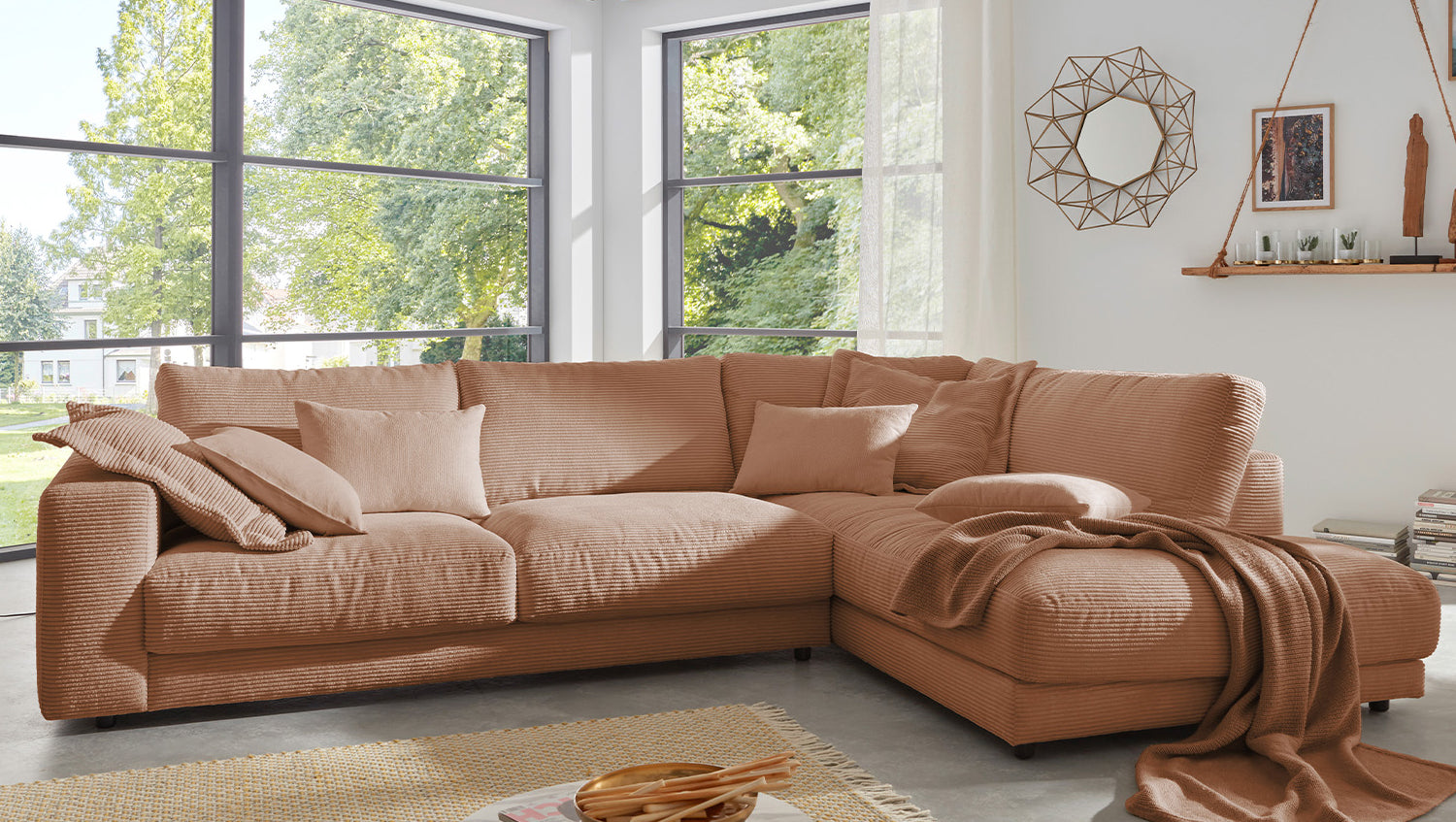 Das KAWOLA Ecksofa MADELINE besticht durch seinen hervorragenden Sitzkomfort, der durch die äußerst legere Polsterung zustande kommt und zum Verweilen und Entspannen einlädt. Die Polsterung passt sich der Körperform an; Sitzabdrücke sowie Wellenbildung der Bezüge sind warentypisch. Der Sitz besteht aus einer Unterfederung mit dauerelastischen Stahl-Wellenfedern und einer oberseitigen Abdeckung sowie losen Sitzkissen aus PUR-Schaum. Sitz und Rücken sind abgedeckt mit einem Inlett, welches befüllt ist mit hochwertigen Füllstoffen, die eine Beimischung von Federn enthalten. Der Bezug aus trendigem Cord-Stoff verleiht dem Big Sofa eine zeitlose Eleganz. Wenn Sie Ihrem Wohnzimmer einen außergewöhnlichen Anstrich verleihen wollen, ist das Sofa MADELINE definitiv das Richtige für Sie!