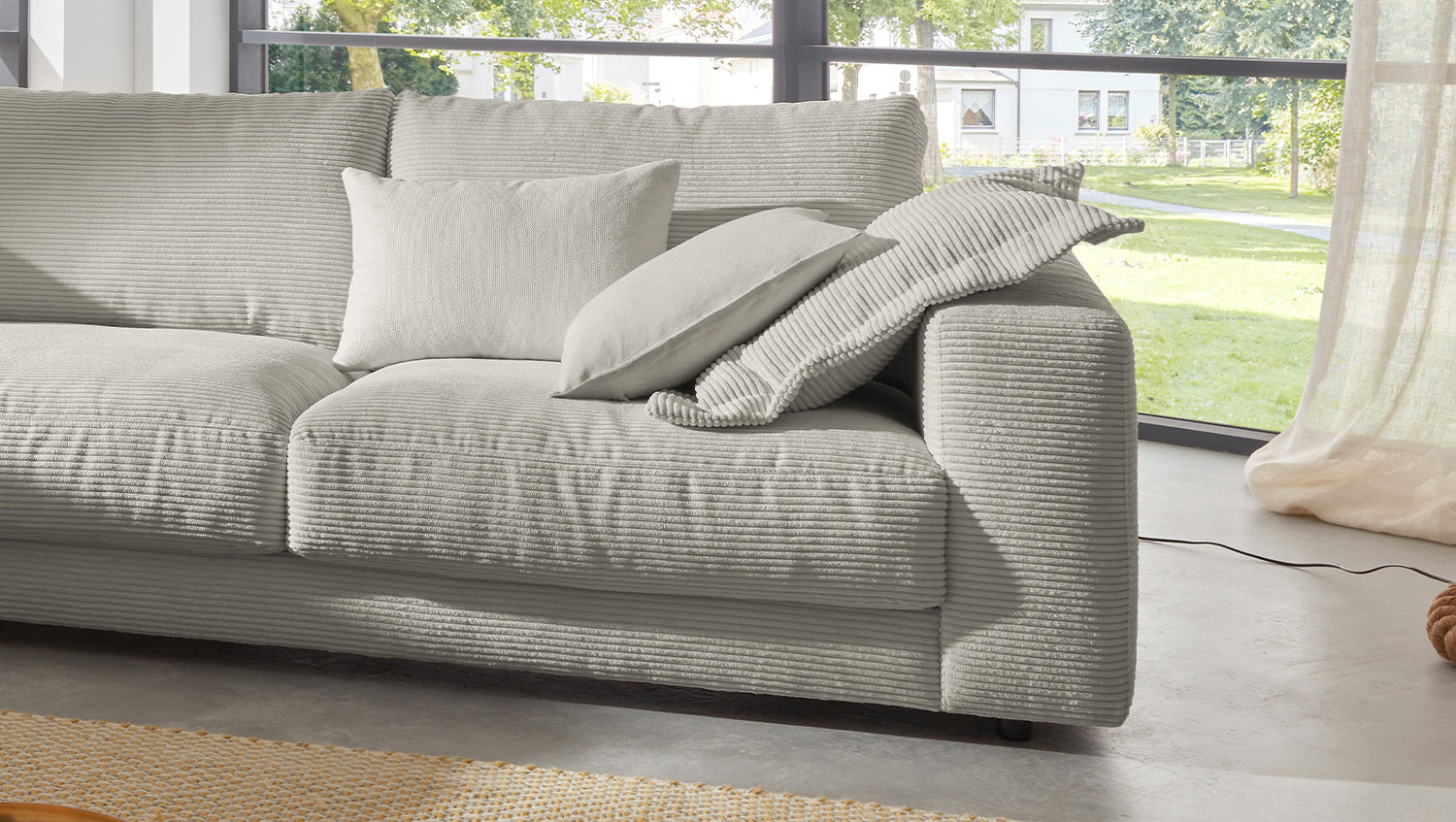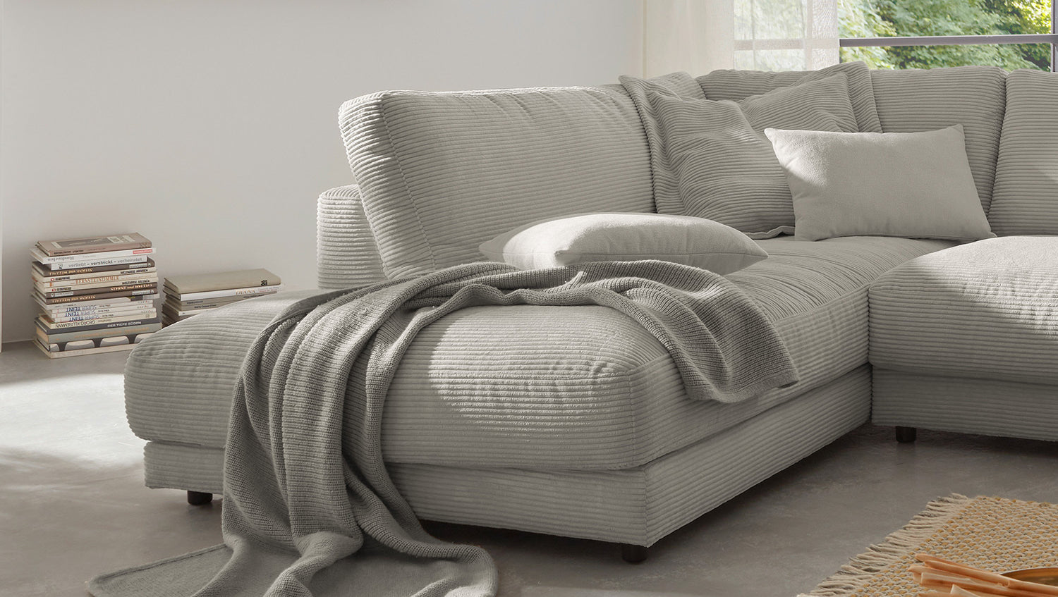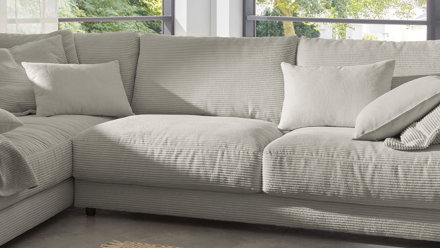 Das KAWOLA Ecksofa MADELINE besticht durch seinen hervorragenden Sitzkomfort, der durch die äußerst legere Polsterung zustande kommt und zum Verweilen und Entspannen einlädt. Die Polsterung passt sich der Körperform an; Sitzabdrücke sowie Wellenbildung der Bezüge sind warentypisch. Der Sitz besteht aus einer Unterfederung mit dauerelastischen Stahl-Wellenfedern und einer oberseitigen Abdeckung sowie losen Sitzkissen aus PUR-Schaum. Sitz und Rücken sind abgedeckt mit einem Inlett, welches befüllt ist mit hochwertigen Füllstoffen, die eine Beimischung von Federn enthalten. Der Bezug aus trendigem Cord-Stoff verleiht dem Big Sofa eine zeitlose Eleganz. Wenn Sie Ihrem Wohnzimmer einen außergewöhnlichen Anstrich verleihen wollen, ist das Sofa MADELINE definitiv das Richtige für Sie!
