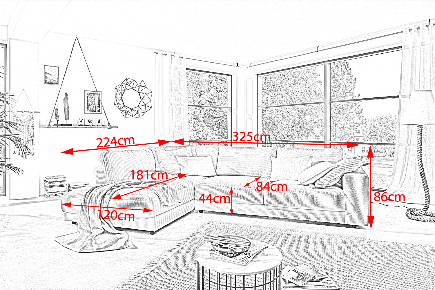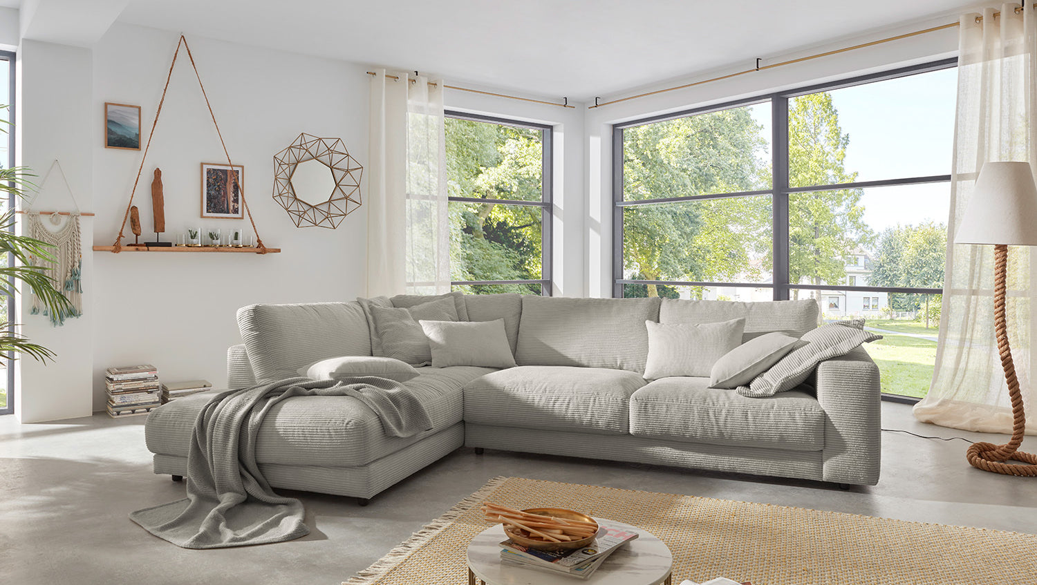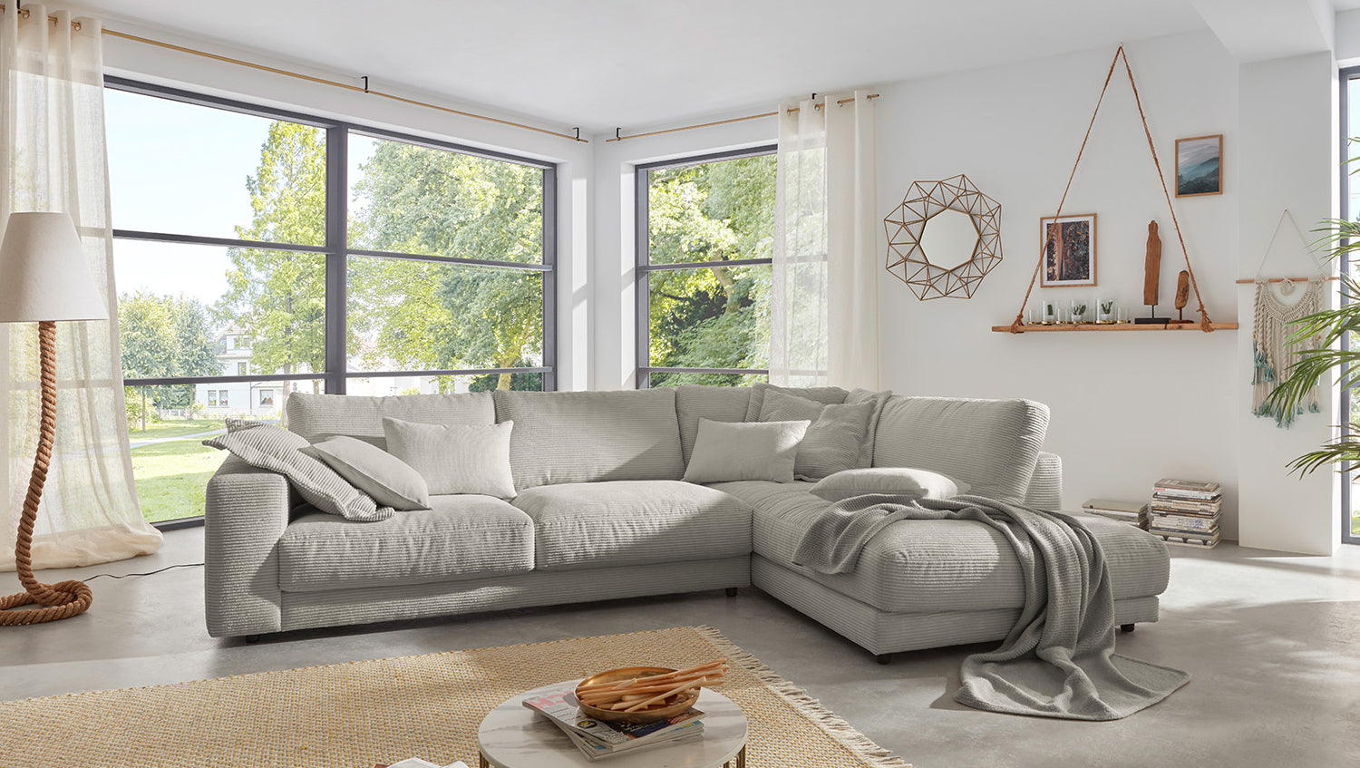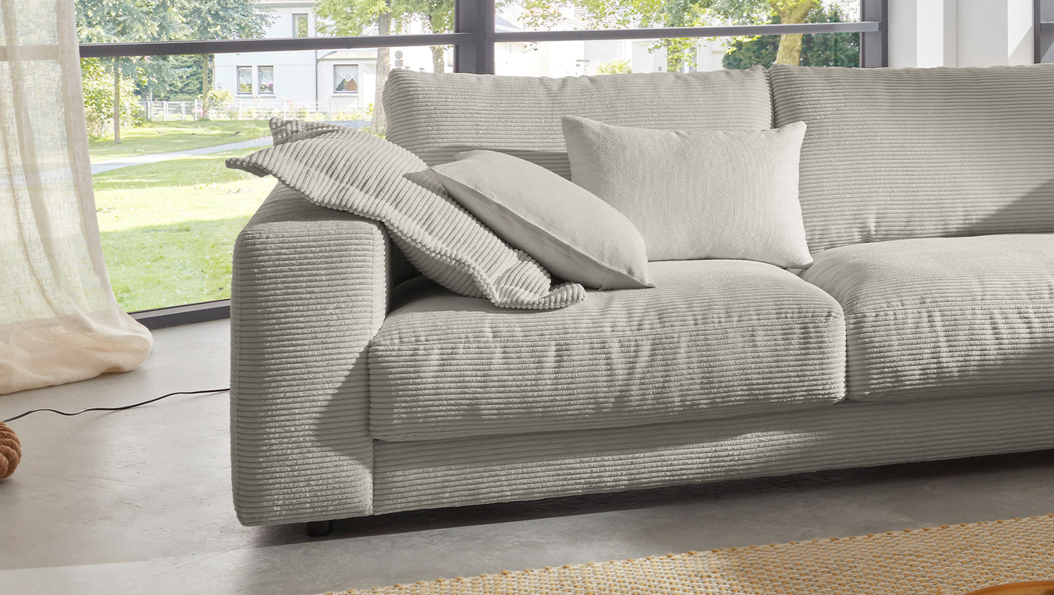 Das KAWOLA Ecksofa MADELINE besticht durch seinen hervorragenden Sitzkomfort, der durch die äußerst legere Polsterung zustande kommt und zum Verweilen und Entspannen einlädt. Die Polsterung passt sich der Körperform an; Sitzabdrücke sowie Wellenbildung der Bezüge sind warentypisch. Der Sitz besteht aus einer Unterfederung mit dauerelastischen Stahl-Wellenfedern und einer oberseitigen Abdeckung sowie losen Sitzkissen aus PUR-Schaum. Sitz und Rücken sind abgedeckt mit einem Inlett, welches befüllt ist mit hochwertigen Füllstoffen, die eine Beimischung von Federn enthalten. Der Bezug aus trendigem Cord-Stoff verleiht dem Big Sofa eine zeitlose Eleganz. Wenn Sie Ihrem Wohnzimmer einen außergewöhnlichen Anstrich verleihen wollen, ist das Sofa MADELINE definitiv das Richtige für Sie!