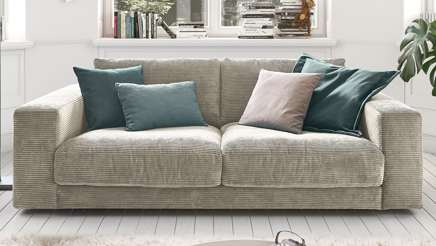 Das KAWOLA 2-Sitzer Sofa MADELINE besticht durch seinen hervorragenden Sitzkomfort, der durch die äußerst legere Polsterung zustande kommt und zum Verweilen und Entspannen einlädt. Die Polsterung passt sich der Körperform an; Sitzabdrücke sowie Wellenbildung der Bezüge sind warentypisch. Der Sitz besteht aus einer Unterfederung mit dauerelastischen Stahl-Wellenfedern und einer oberseitigen Abdeckung sowie losen Sitzkissen aus PUR-Schaum. Sitz und Rücken sind abgedeckt mit einem Inlett, welches befüllt ist mit hochwertigen Füllstoffen, die eine Beimischung von Federn enthalten. Der Bezug aus trendigem Cord-Stoff verleiht dem 2-Sitzer eine zeitlose Eleganz. Wenn Sie Ihrem Wohnzimmer einen außergewöhnlichen Anstrich verleihen wollen, ist das Sofa MADELINE definitiv das Richtige für Sie!