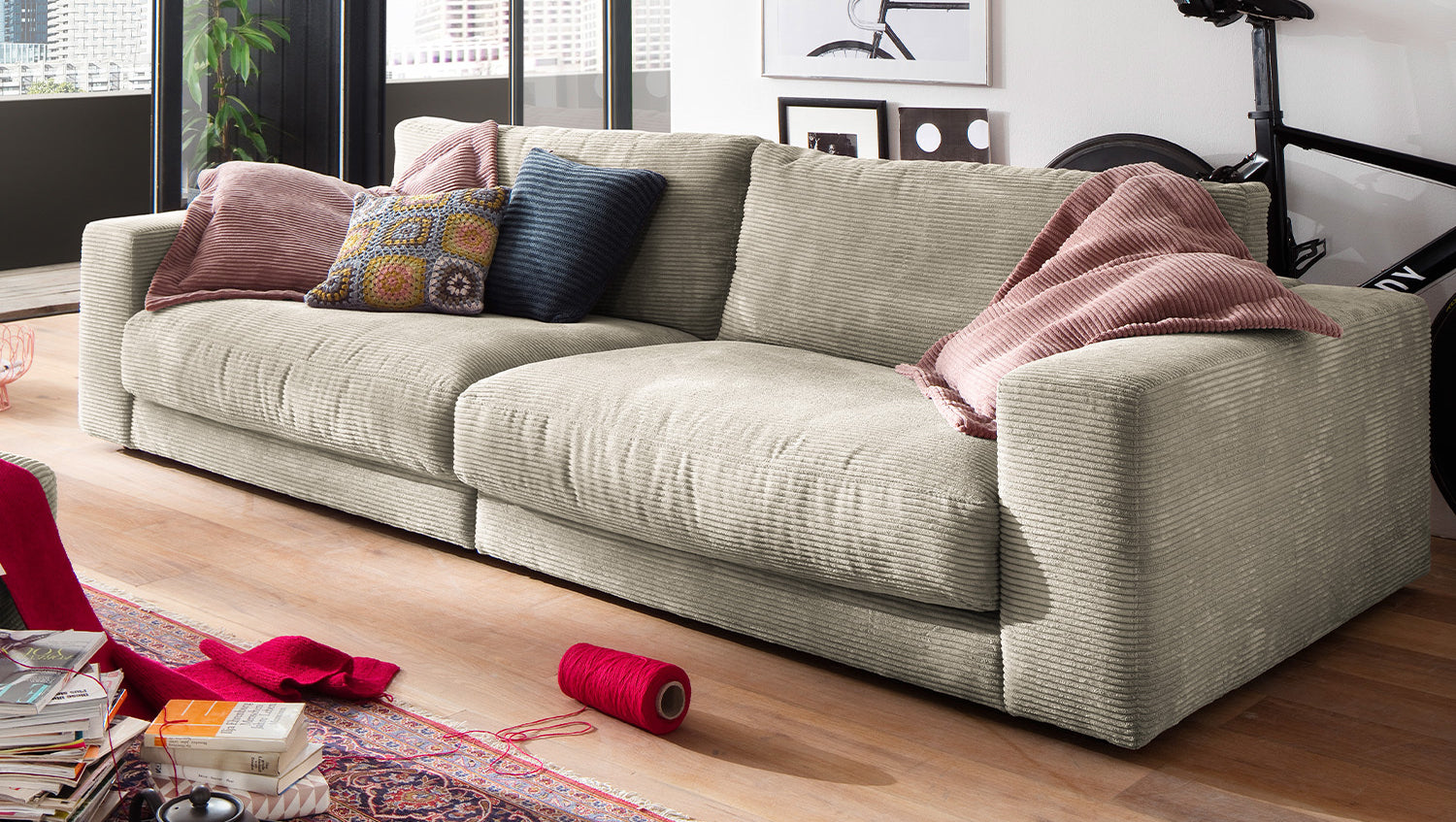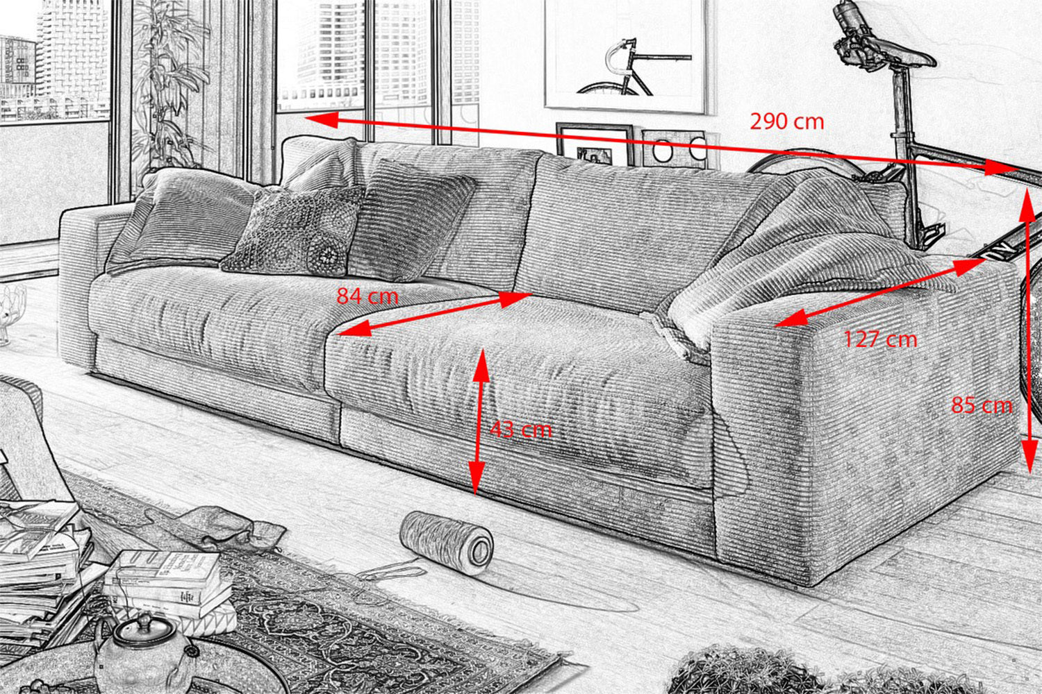 Das KAWOLA 3-Sitzer Sofa MADELINE besticht durch seinen hervorragenden Sitzkomfort, der durch die äußerst legere Polsterung zustande kommt und zum Verweilen und Entspannen einlädt. Die Polsterung passt sich der Körperform an; Sitzabdrücke sowie Wellenbildung der Bezüge sind warentypisch. Der Sitz besteht aus einer Unterfederung mit dauerelastischen Stahl-Wellenfedern und einer oberseitigen Abdeckung sowie losen Sitzkissen aus PUR-Schaum. Sitz und Rücken sind abgedeckt mit einem Inlett, welches befüllt ist mit hochwertigen Füllstoffen, die eine Beimischung von Federn enthalten. Der Bezug aus trendigem Cord-Stoff verleiht dem 3-Sitzer eine zeitlose Eleganz. Wenn Sie Ihrem Wohnzimmer einen außergewöhnlichen Anstrich verleihen wollen, ist das Sofa MADELINE definitiv das Richtige für Sie!