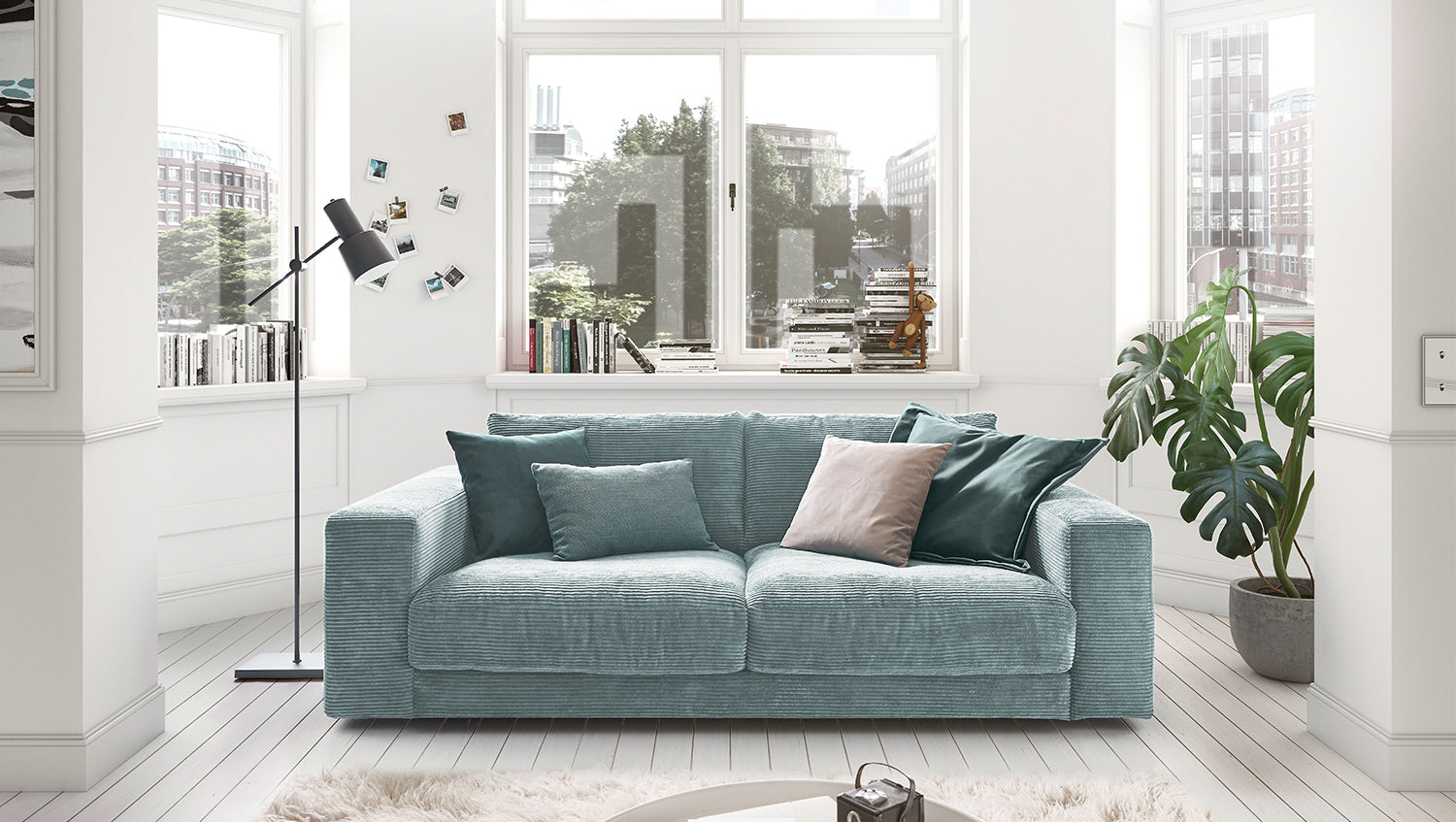 KAWOLA Sofa MADELINE 2-Sitzer Cord hellblau