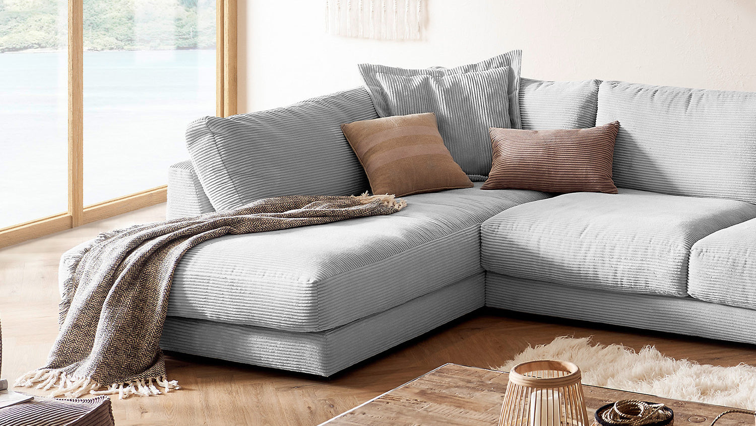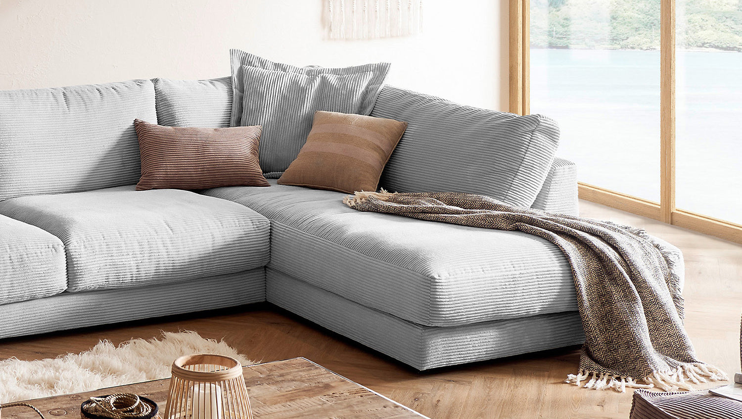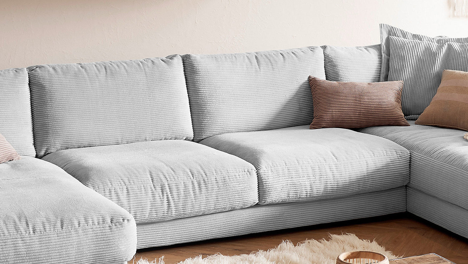 KAWOLA Sofa MADELINE Wohnlandschaft U-Form Cord hellgrau