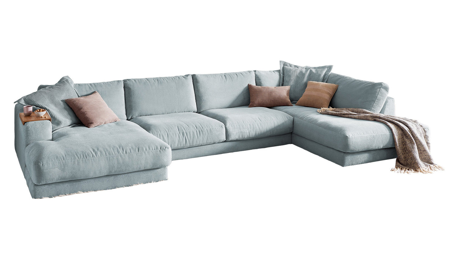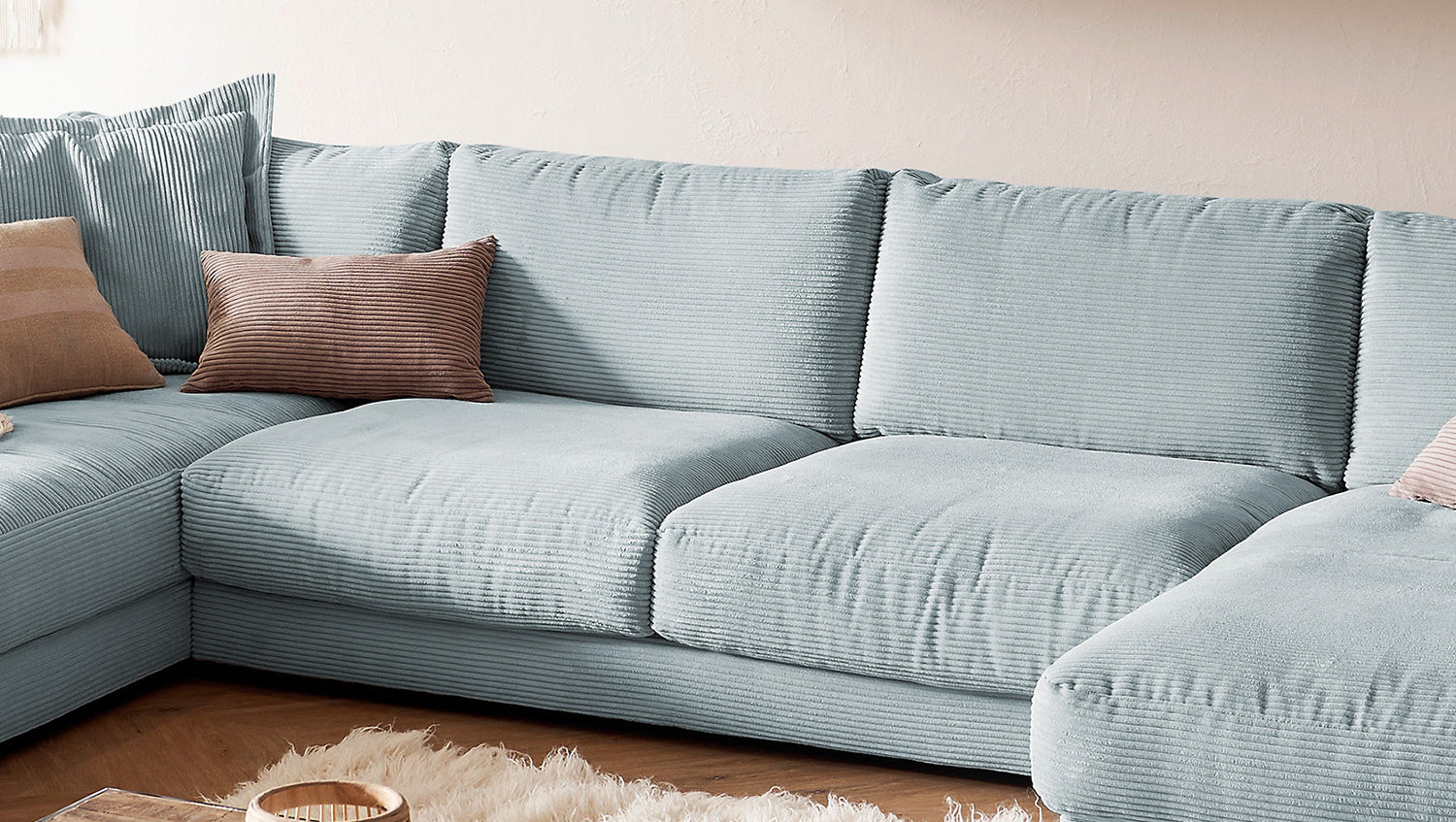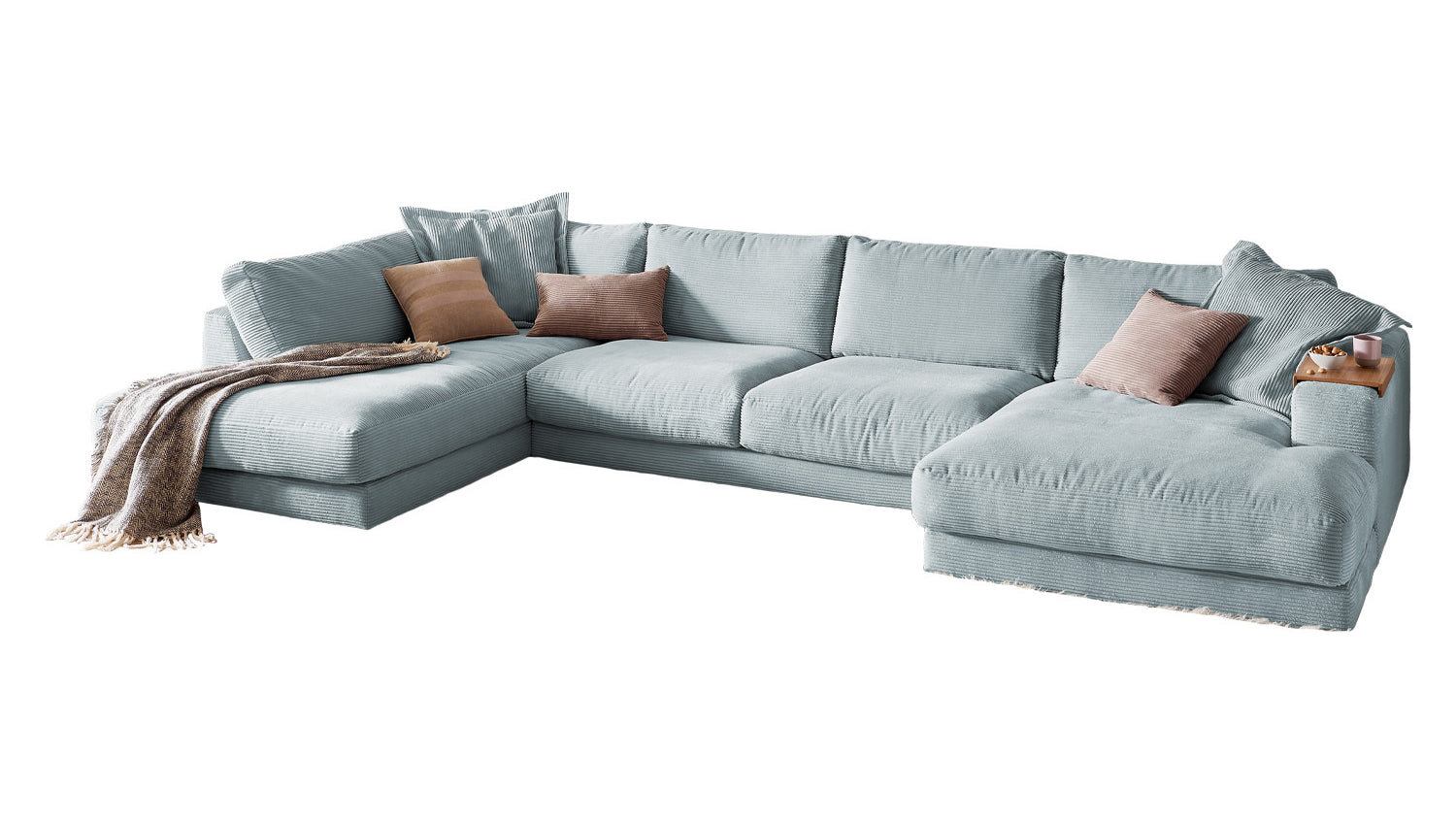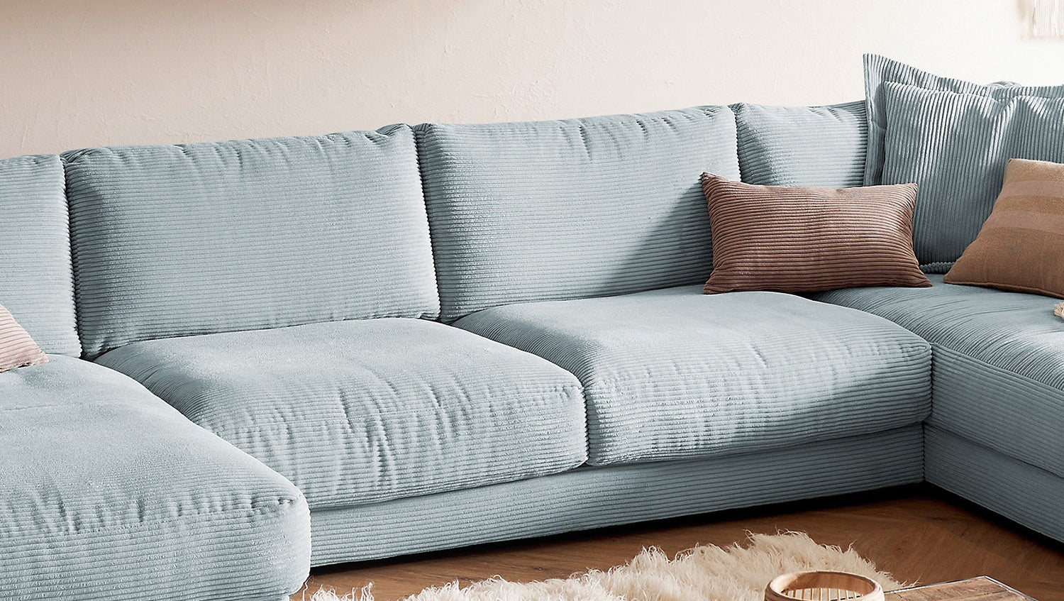 KAWOLA Sofa MADELINE Wohnlandschaft U-Form Cord hellblau