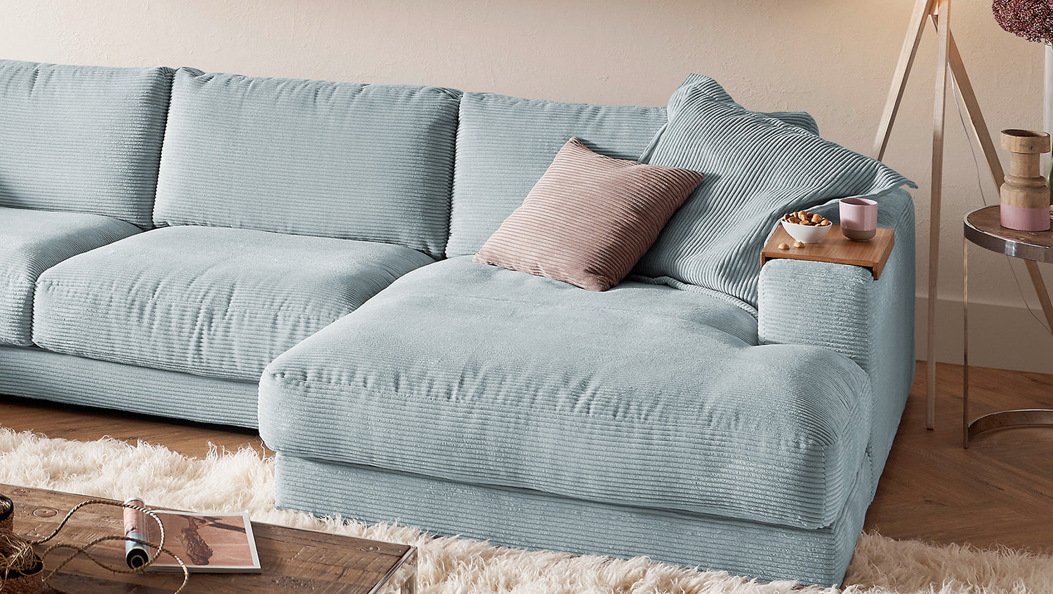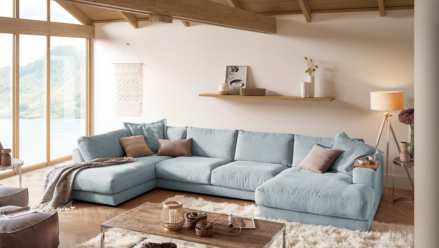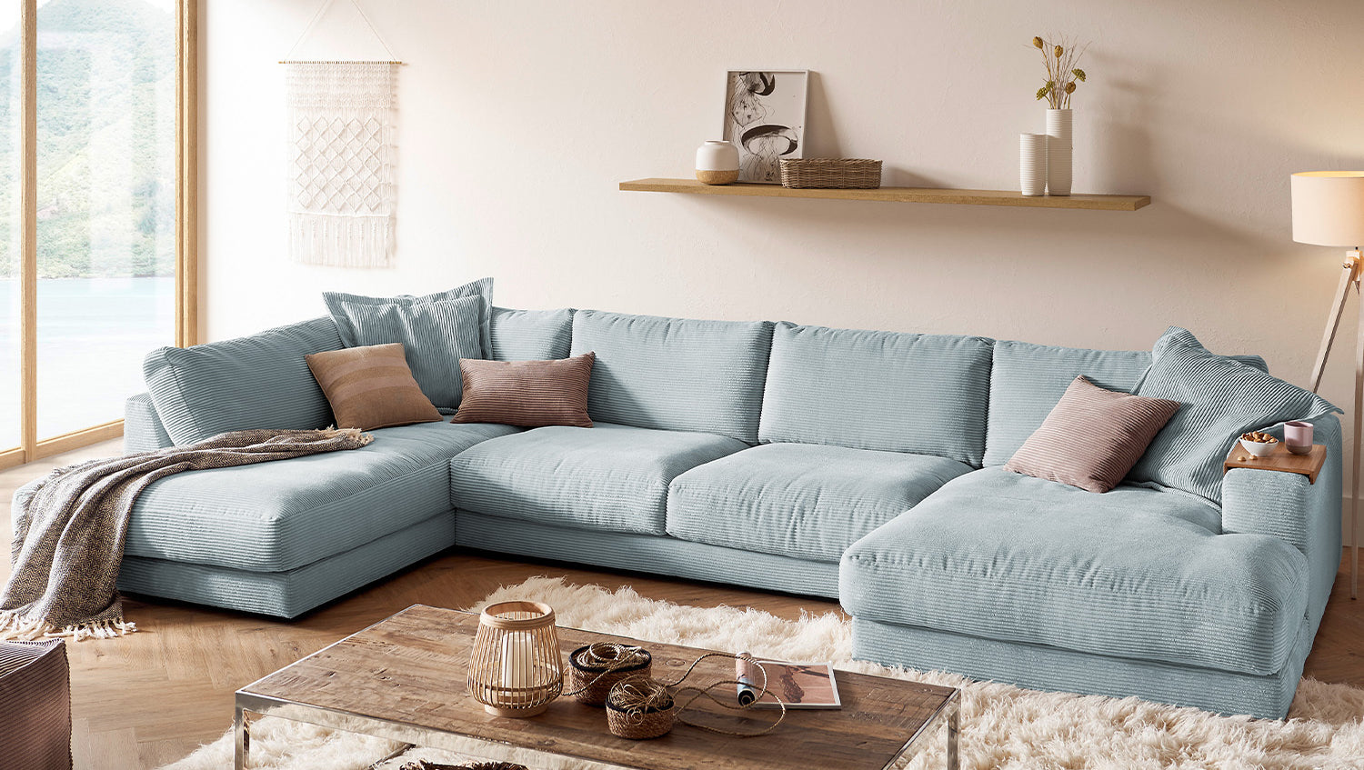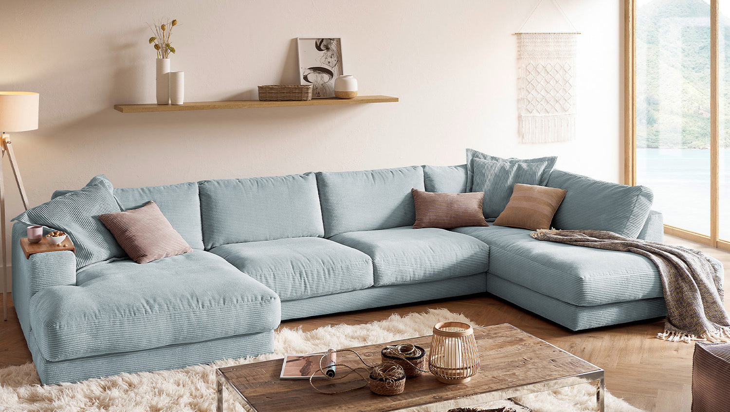 KAWOLA Sofa MADELINE Wohnlandschaft U-Form Cord hellblau