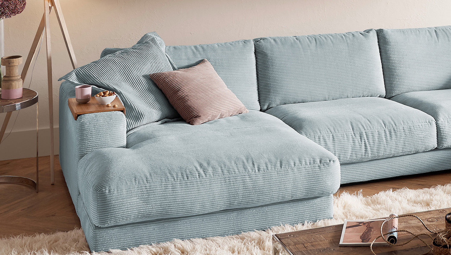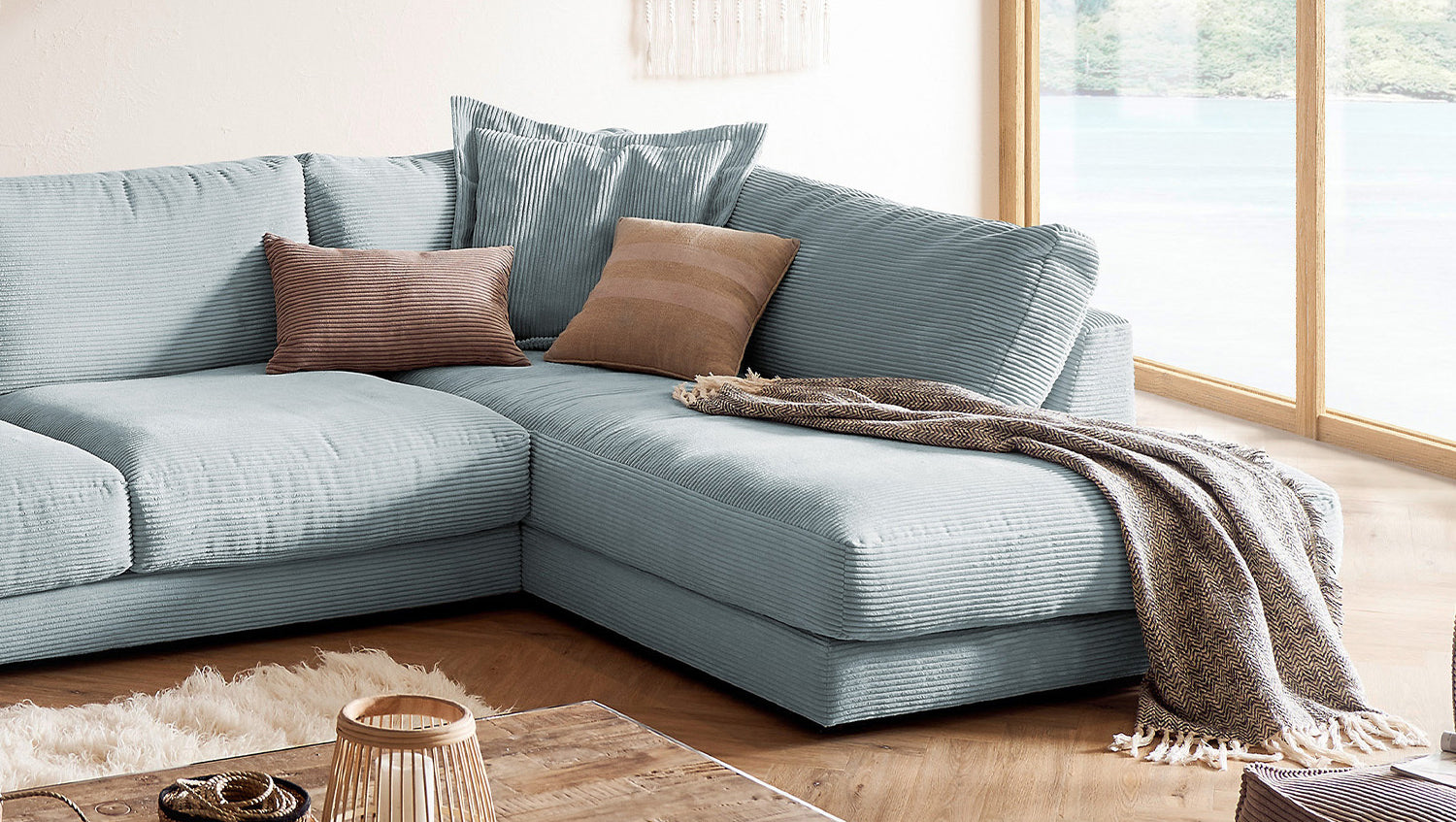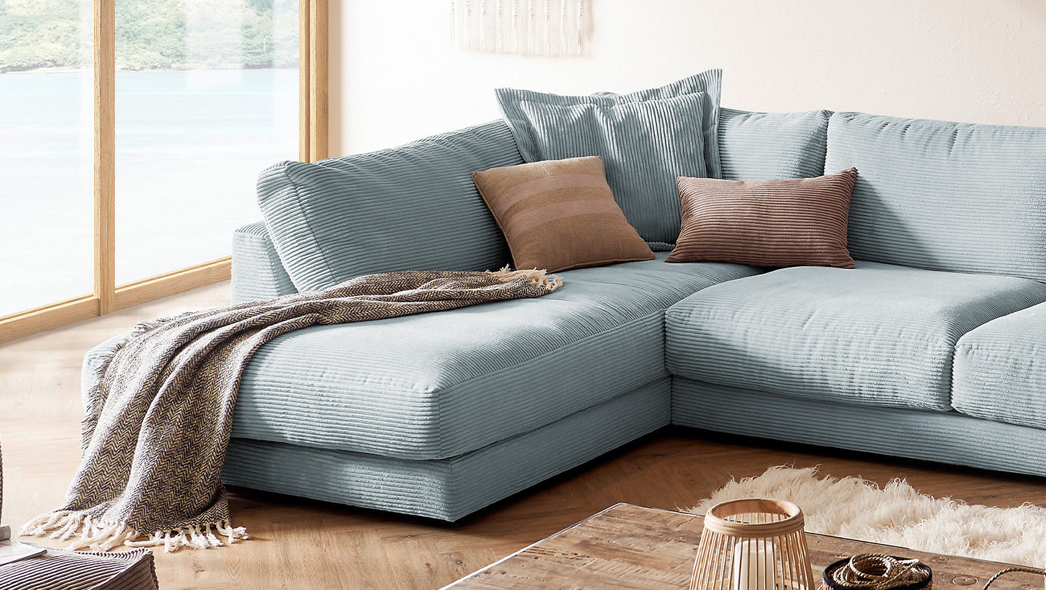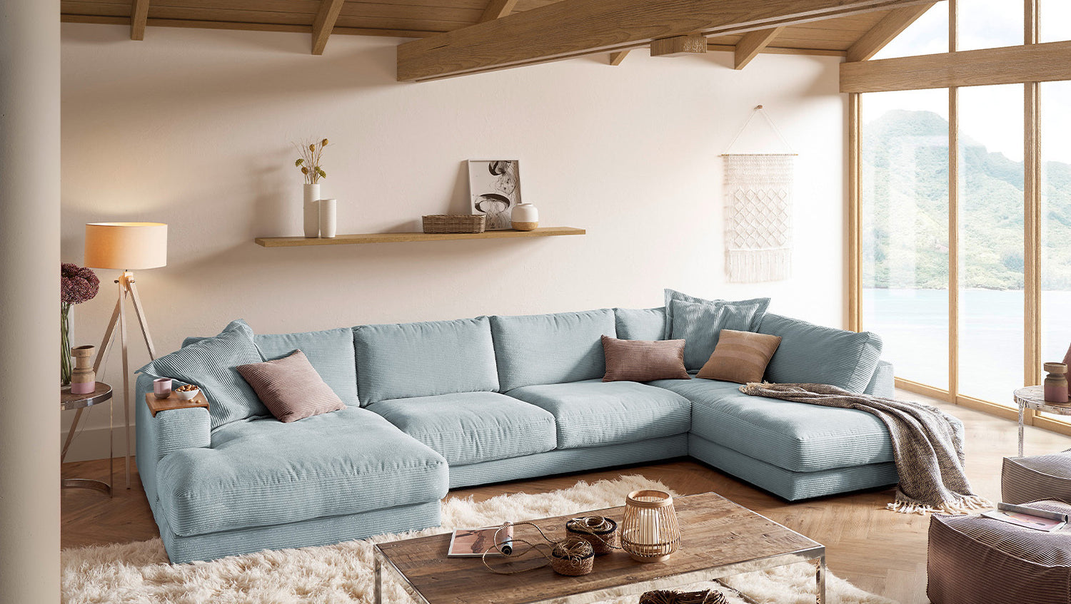 KAWOLA Sofa MADELINE Wohnlandschaft U-Form Cord hellblau