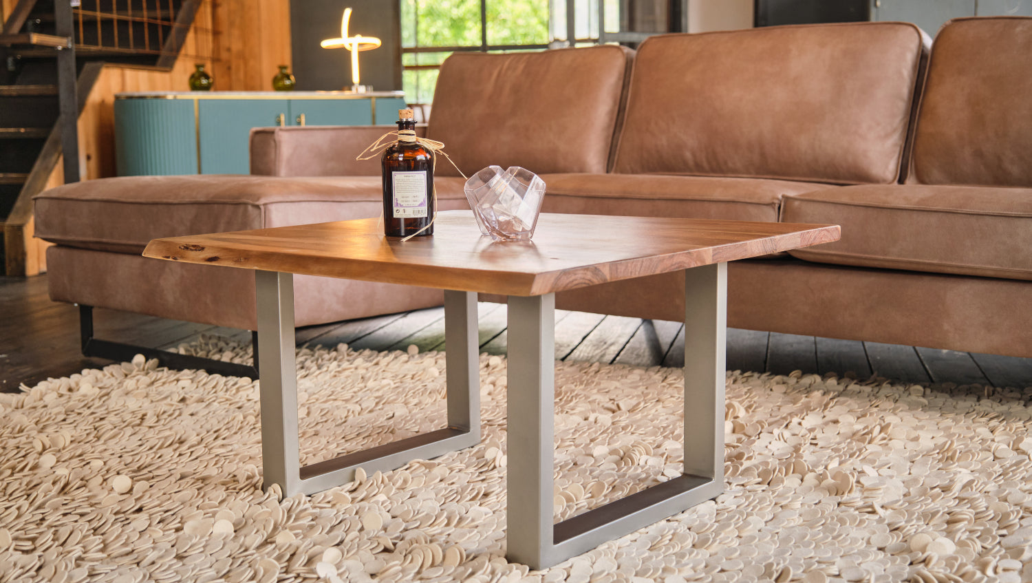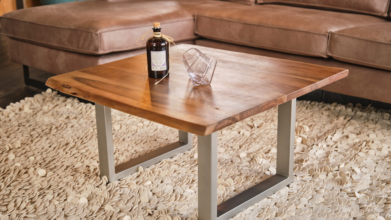 Die Tischkante entspricht der natürlichen Form eines Baumes und bildet einen harmonischen und geschmackvollen Kontrast zu dem modernen Kufengestell aus Metall. So vereint der Beistelltisch das Traditionelle mit dem Modernen auf eine leichte Weise. Durch diese Kombination findet der Couchtisch LORE überall ein Zuhause und bereichert jeden Wohnraum auf eine dezente, unaufdringliche Weise.