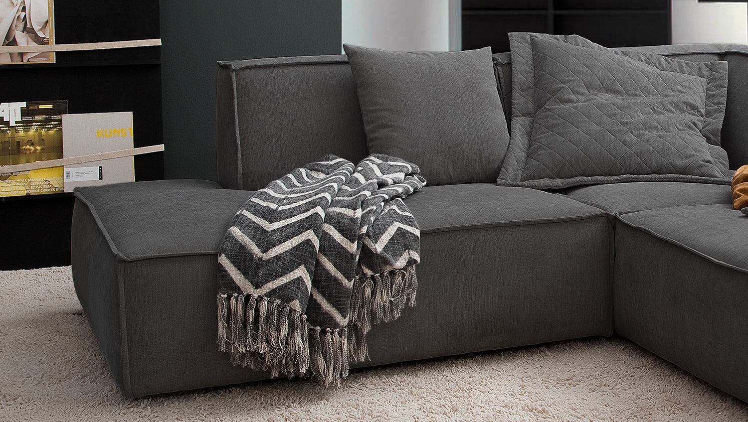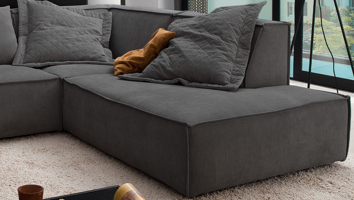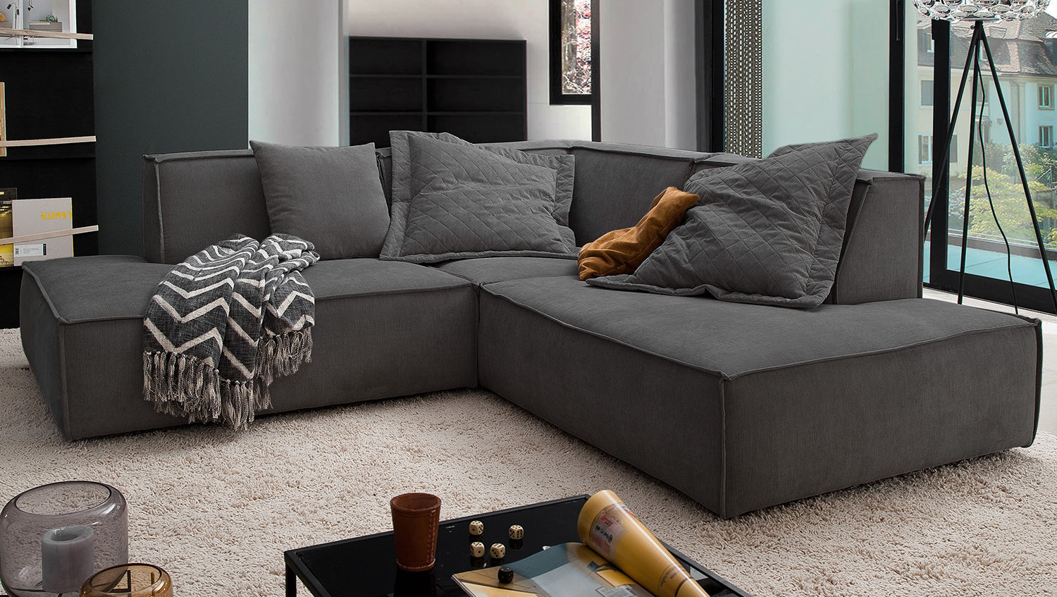 Das KAWOLA Ecksofa SAMU besticht durch seinen hervorragenden Sitzkomfort, der durch den äußerst weichen und legeren Polsteraufbau zustande kommt und zum Verweilen und Entspannen einlädt. Die Polsterung passt sich der Körperform an; Sitzabdrücke sowie Wellenbildung der Bezüge sind warentypisch. Seine moderne und urbane Form verleihen dem Sofa sein unverwechselbares Aussehen und bieten ausreichend Platz, um gemütliche Abende zu verbringen. Mit seinem zeitlosen Design fügt es sich nahtlos in jede Umgebung ein und macht auch frei im Raum stehend eine gute Figur. Wenn Sie Ihrem Wohnzimmer einen außergewöhnlichen Anstrich verleihen wollen, ist das Sofa SAMU definitiv das Richtige für Sie!