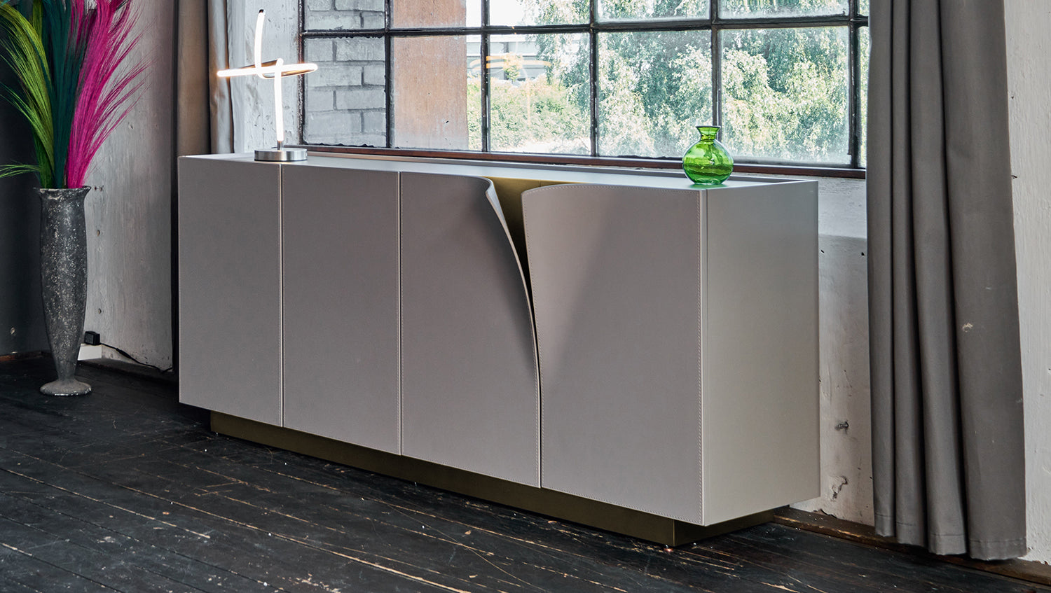 Willkommen zur Vorstellung des exquisiten Sideboards EMMA von KAWOLA! Dieses moderne Möbelstück in stilvollem Grau vereint Funktionalität und Ästhetik, perfekt für den urbanen Flair eines modernen Großstadtlofts. Mit 8 Fächern bietet das EMMA Sideboard bietet ausreichend Stauraum für optimale Organisation. Die Front aus Kunstleder-beschichtetem Metall, leicht nach vorne gebogen an zwei Stellen, dient als raffiniertes Designelement und Griff für die Türen. Die Ablagefläche mit eleganter Mattglas-Platte sieht nicht nur edel aus, sondern bietet auch eine robuste Oberfläche für Dekorationen oder elektronische Geräte. Der Sockel aus gebürstetem Edelstahl verleiht dem EMMA Sideboard zeitlose Eleganz, Stabilität und Langlebigkeit. Ob als stilvoller Schrank oder Blickfang im Wohnzimmer - das EMMA Sideboard von KAWOLA ist ein absolutes Must-Have. Holen Sie sich dieses außergewöhnliche Möbelstück und verwandeln Sie Ihr Wohnzimmer in einen Ort der Eleganz, der den urbanen Lifestyle perfekt widerspiegelt.