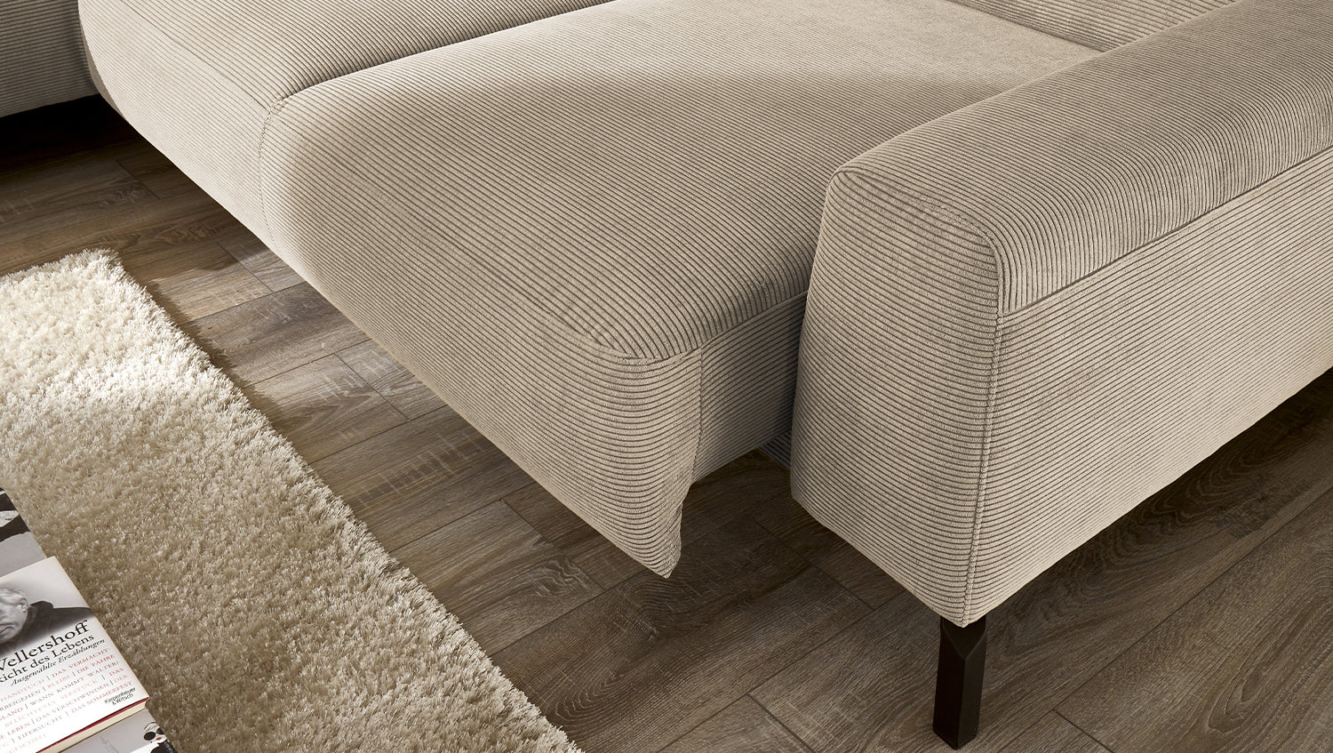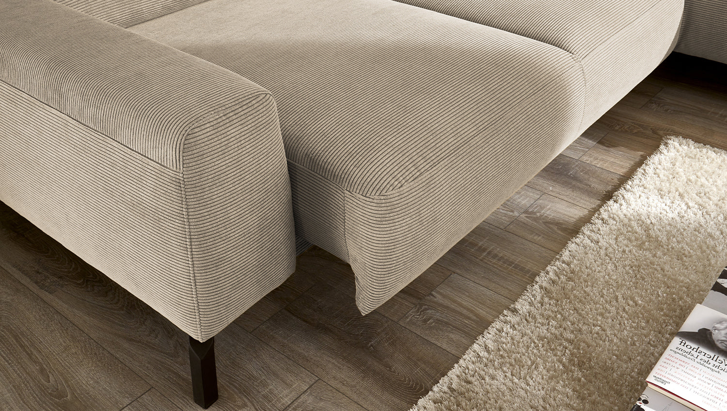 Entdecken Sie das exklusive Ecksofa DELIA von KAWOLA – ein wahres Meisterwerk in puncto Design und Komfort. Der Rundumbezug aus filigranem Feincord verleiht diesem Sofa eine luxuriöse Note und sorgt für ein einladendes Ambiente. Die schwarzen Metallfüße setzen elegante Akzente und garantieren Stabilität.