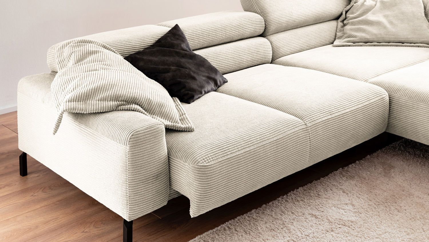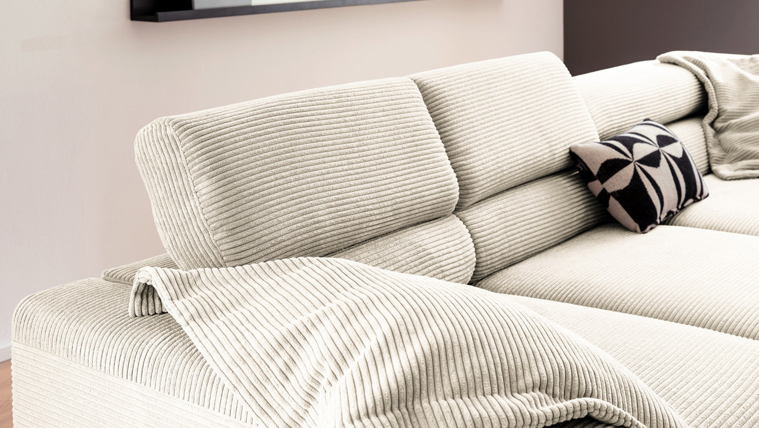 Ein Highlight ist die innovative Kopfteilverstellung, mit der Sie die Kopfteile individuell neigen oder aufrecht stellen können. Perfekt für entspannte Abende beim Lesen oder Filme schauen. Das Ecksofa DELIA vereint Funktionalität und Stil auf höchstem Niveau.
