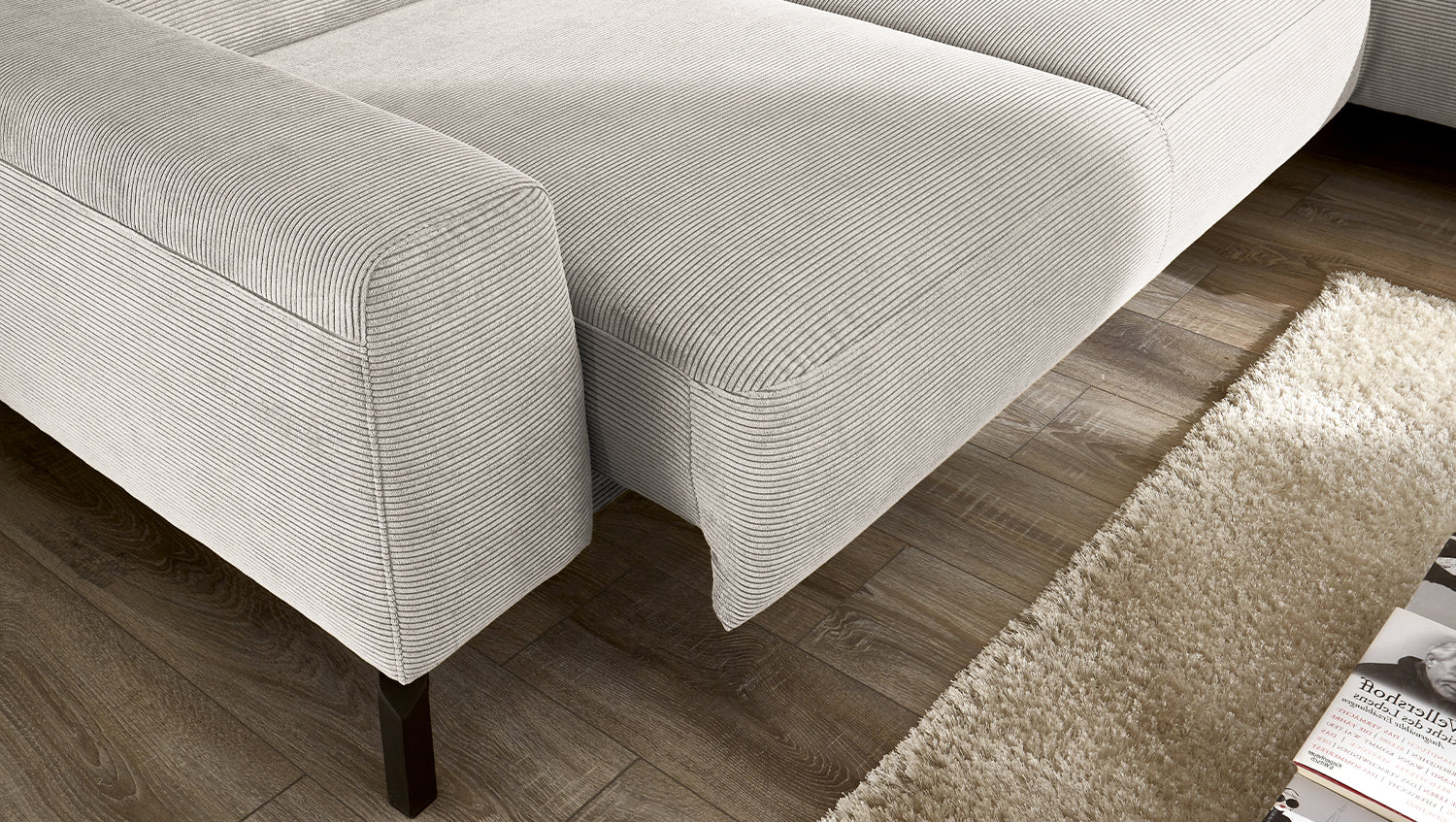 Entdecken Sie das exklusive Ecksofa DELIA von KAWOLA – ein wahres Meisterwerk in puncto Design und Komfort. Der Rundumbezug aus filigranem Feincord verleiht diesem Sofa eine luxuriöse Note und sorgt für ein einladendes Ambiente. Die schwarzen Metallfüße setzen elegante Akzente und garantieren Stabilität.