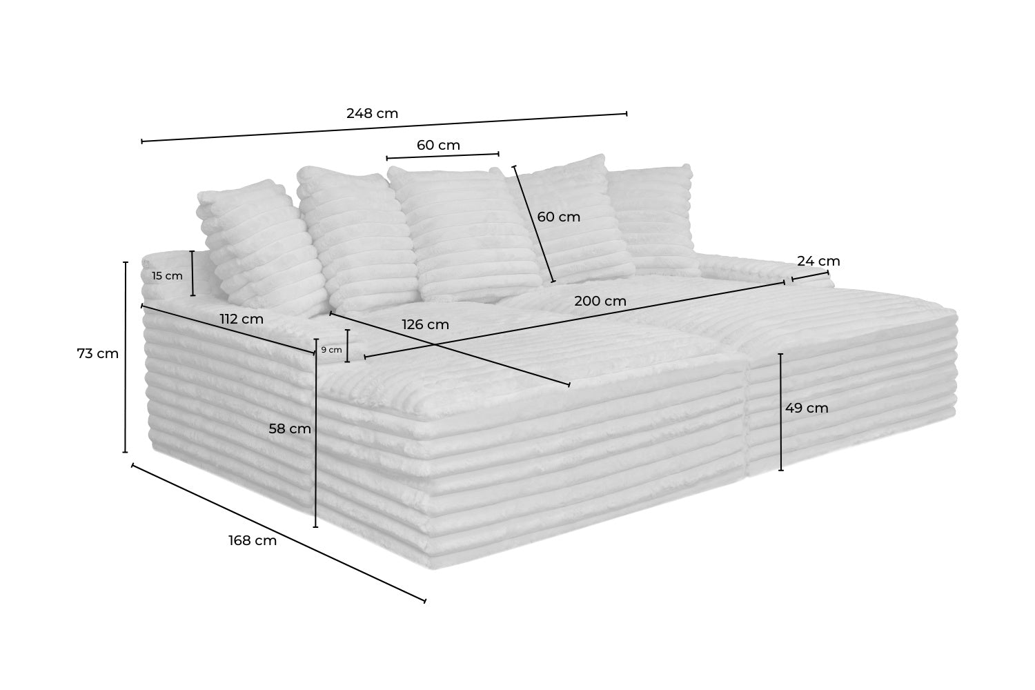 Mit einer großzügigen Breite von 248 cm und einer beeindruckenden Sitztiefe von 168 cm bietet CADY Platz für bis zu 3 Personen - perfekt für entspannte Stunden. Der weiche Sitzkomfort, kombiniert mit 6 großen Rückenkissen, garantiert Gemütlichkeit auf höchstem Niveau. Der Cordstoff zeichnet sich durch geringe Pillingbildung aus, was die Langlebigkeit unterstützt.
