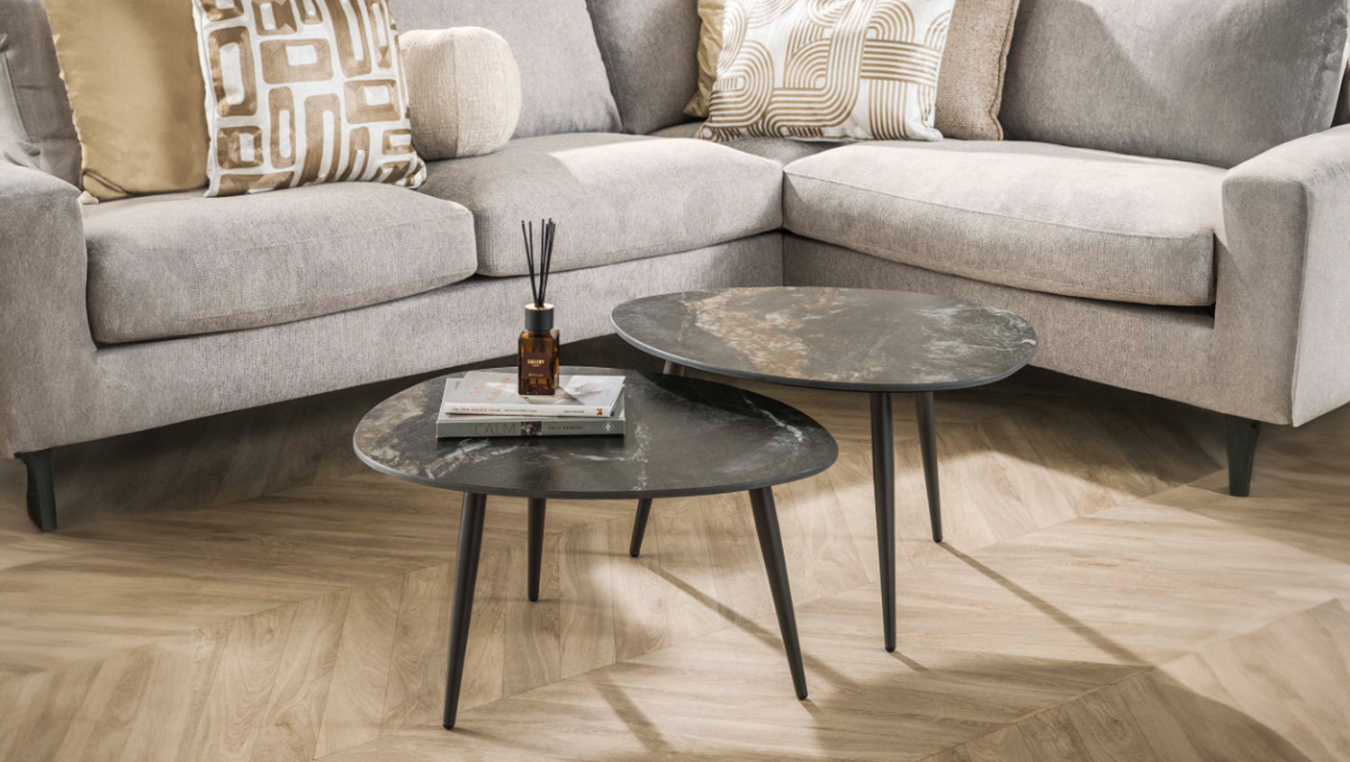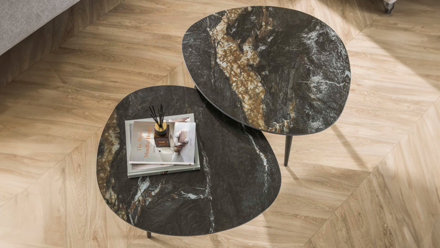 Das elegante, organisch geformte Couchtisch-Set PONTE von KAWOLA kombiniert ein minimalistisches Gestell mit einer luxuriösen Keramikplatte, die ihm einen raffinierten Look verleiht - perfekt für moderne und klassische Interieurs. Diese Tische sind vielseitig und funktional. Das Set besteht aus zwei Tischen. Beide Tische haben eine Fläche von 70 x 58 cm, bei einer Höhe von 40 cm bzw. 35 cm. Ob modern, rustikal oder klassisch – das PONTE Couchtisch-Set passt sich dank seines zeitlosen Looks mühelos jedem Einrichtungsstil an. Ideal als stilvoller Mittelpunkt im Wohnzimmer und ein echtes Highlight für Liebhaber hochwertiger Möbel.