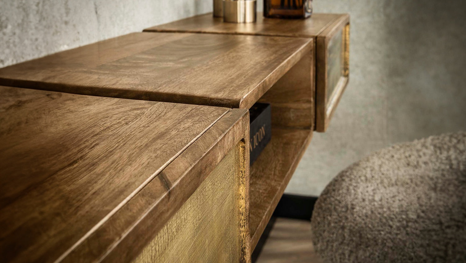 Der Schminktisch BRASY von KAWOLA ist ein Statement von zeitloser Eleganz und luxuriösem Flair. Gefertigt aus massivem Mangoholz, besticht er durch seine natürlichen Holztöne, die perfekt mit den edlen Messingbeschlägen harmonieren. Das echte, leicht antikisierte Messing verleiht den Fronten eine exklusive, schimmernde Patina, die alle Blicke auf sich zieht. BRASY bietet mit einem offenen Fach und zwei praktischen Schubladen intelligenten Stauraum. Die Montage erfolgt denkbar einfach über stabile Streifen, die direkt an der Wand befestigt werden, wodurch das Möbelstück elegant zu schweben scheint. Mit seinen Maßen von 123x30x15 cm ist dieses vielseitige Möbelstück ideal als stilvolle Frisierkommode oder als repräsentativer Flurtisch.