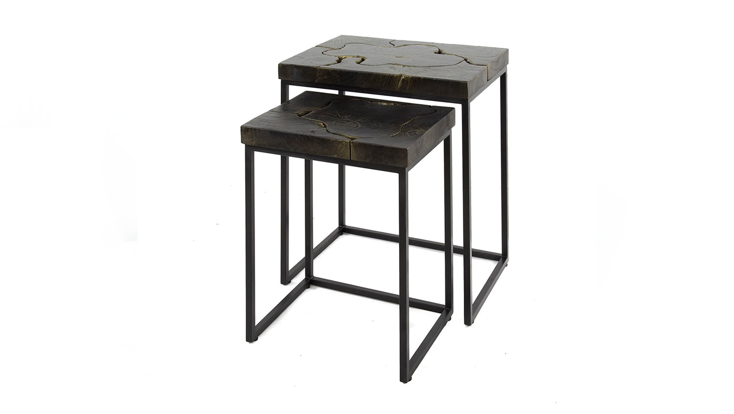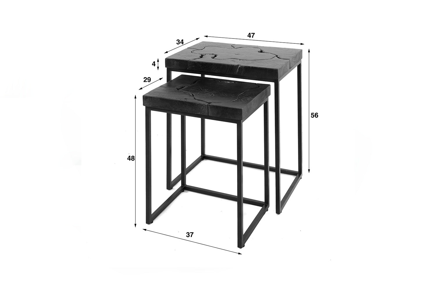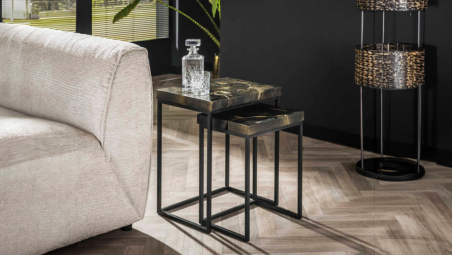 Das Beistelltisch-Set ESCADO von KAWOLA bringt Natur und modernes Design in perfekte Balance. Die Tische haben beide eine rechteckige Platte aus Teakholz und ein Gestell aus schwarzem, pulverbeschichtetem Metall. Die Tischplatten sind in diesem schönen schwarz-goldenen Finish gespritzt. Das Set besteht aus zwei quadratischen Tischen, die flexibel kombiniert werden können. Der größere Tisch misst 47 x 34 x 56 cm, der kleinere Tisch misst 37 x 29 x 48 cm. Da die Tische einen Höhenunterschied von ca. 5 cm aufweisen, lassen sie sich gut untereinander stellen. Ob im Wohnzimmer, in der Lounge oder als stilvolle Ablage – das Couchtisch-Set ESCADO passt in jedes Zuhause und setzt ein echtes Design-Statement.