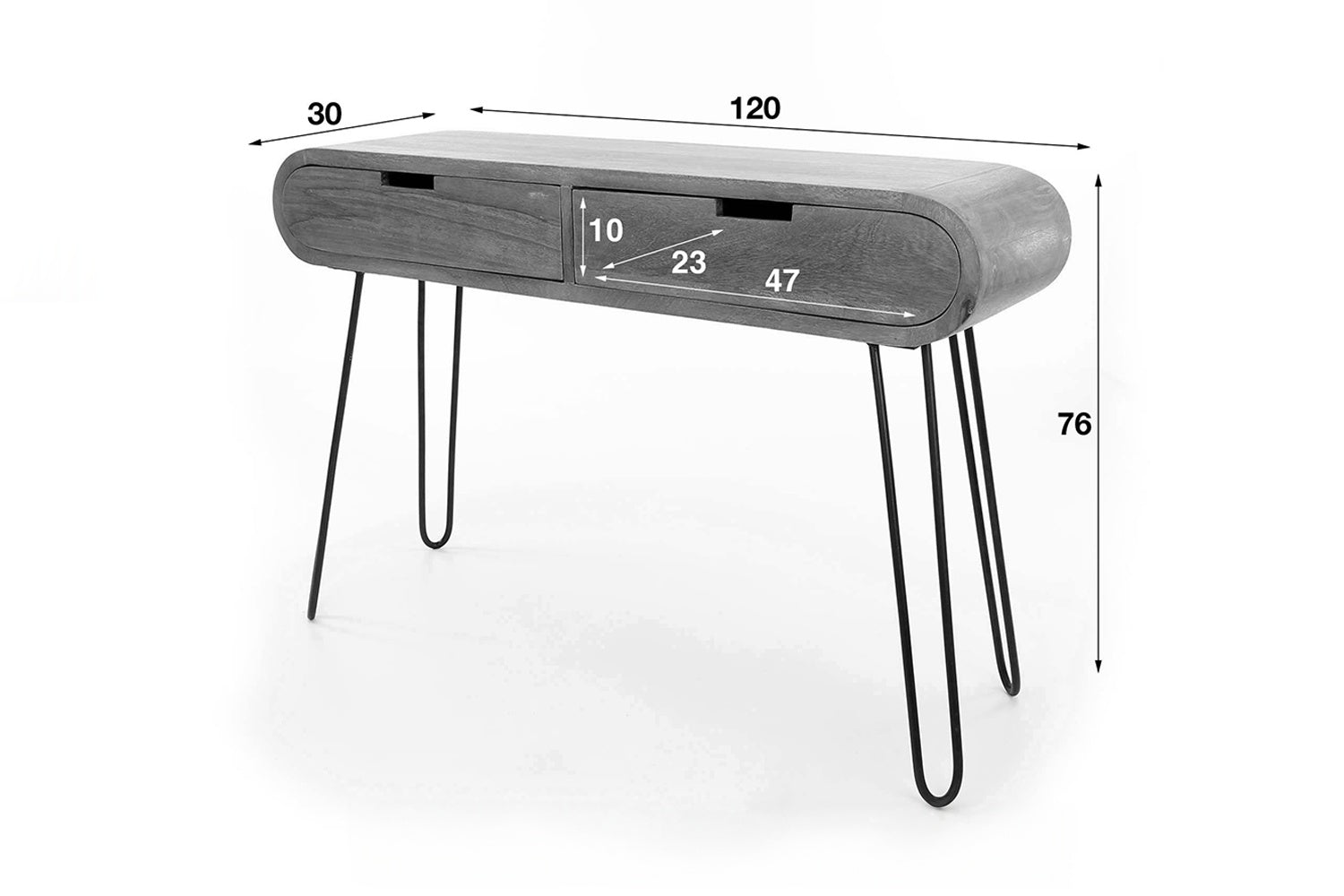 Der Schminktisch/Flurtisch BAEL von KAWOLA ist ein Statement modernen Designs, das natürliche Wärme mit urbanem Flair verbindet. Gefertigt aus hochwertigem Mangoholz mit einer tiefen braunen Oberfläche, besticht er durch seine auffällige runde Form, die ihm einen absolut trendigen Look verleiht. Die filigranen Beine aus schwarz pulverbeschichtetem Metall bilden einen stilvollen Kontrast und sorgen für höchste Stabilität. Mit zwei integrierten Schubladen bietet BAEL praktischen Stauraum, während seine Maße (120x30x76 cm) ihn vielseitig einsetzbar machen – ob als eleganter Frisiertisch für Ihr Schlafzimmer oder als einladender Flurtisch in Ihrem Eingangsbereich: ein markantes Möbelstück, das Funktionalität und Ästhetik perfekt vereint.
