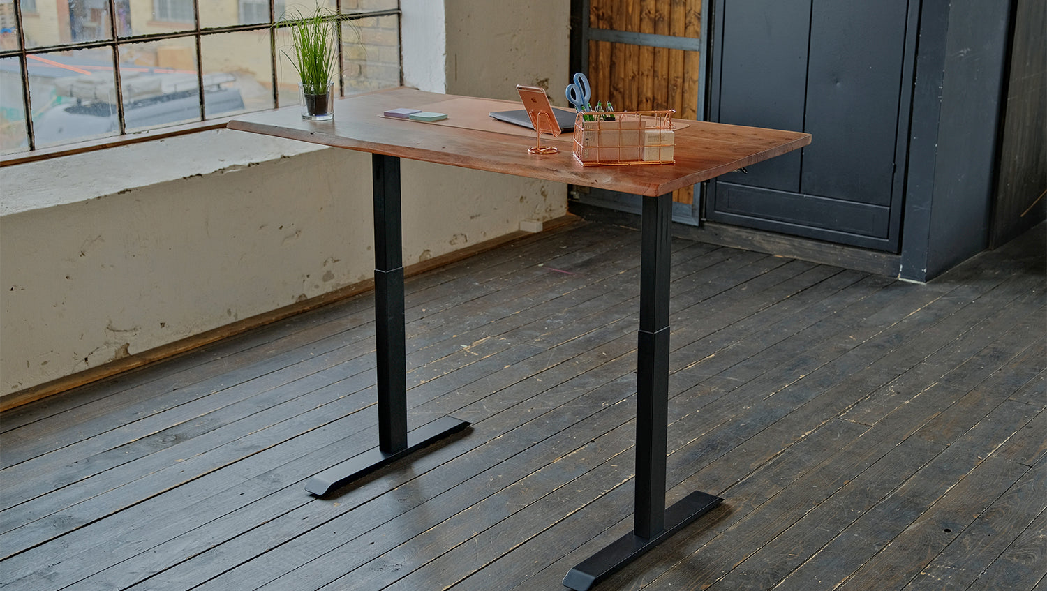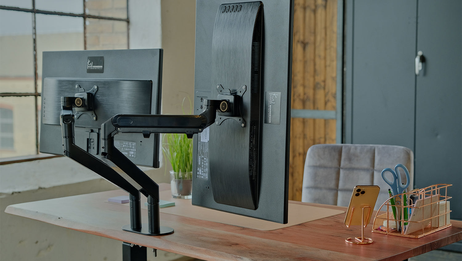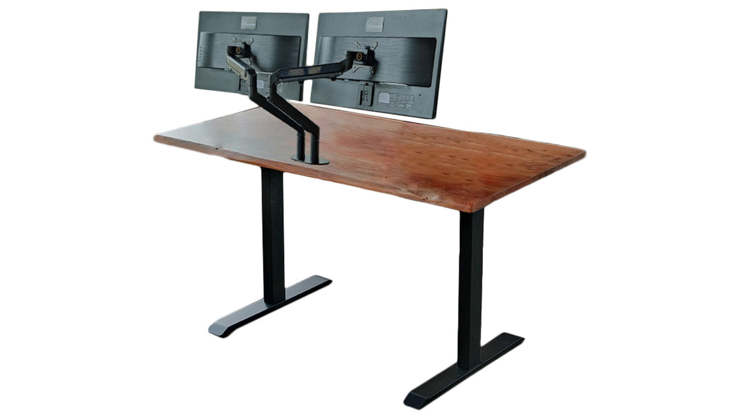 KAWOLA Schreibtisch LORA mit Monitorhalterung elektrisch höhenverstellbar mit Baumkante Nussbaumfarben massiv