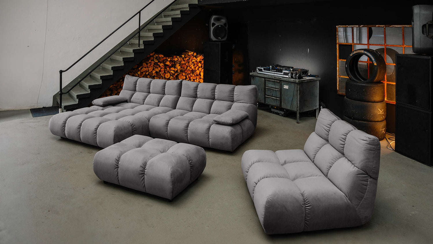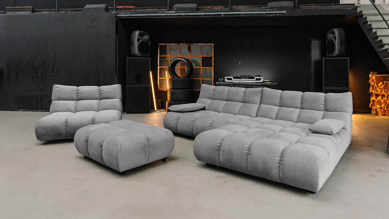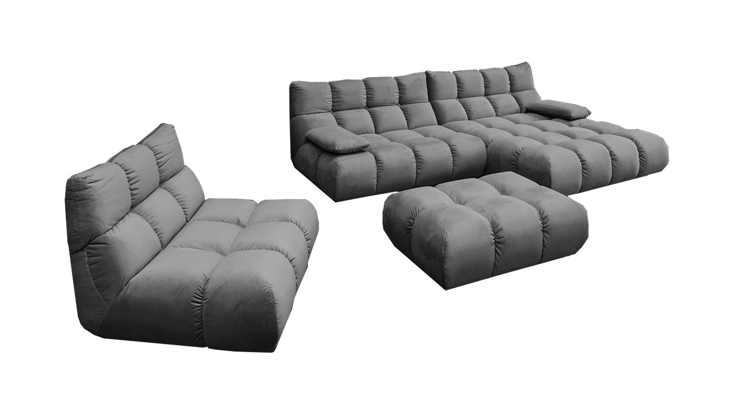 Der Bezug aus edlem Velvet verleiht der Sitzgruppe eine elegante Note. Die samtweiche Oberfläche und der feine Glanz machen jedes Möbelstück zum Blickfang und schaffen ein luxuriöses Ambiente.