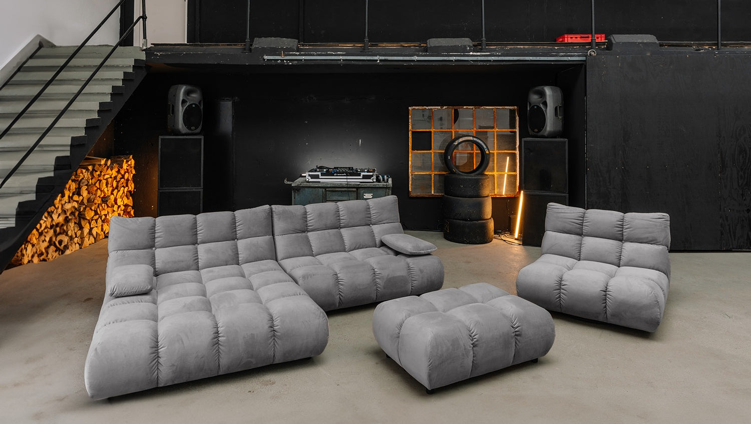 Das Ecksofa lädt mit seiner tiefen Sitzfläche und der gemütlichen Polsterung zum Entspannen ein. Die Hockerbank ergänzt das Sofa flexibel als Sitzgelegenheit, Fußhocker oder Ablagefläche. Der Drehsessel sorgt mit seiner 360°-Funktion für Bewegungsfreiheit und bietet dabei eine komfortable Sitzfläche.